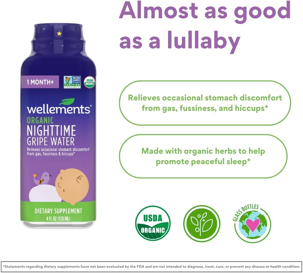 Eases Upset Tummies – Our Organic Nighttime Gripe Water for babies uses certified-organic ingredients to safely help ease occasional stomach discomfort and gas, often associated with baby colic, fussiness, and hiccups10Promotes a Restful Sleep* – A blend of safe & organic sleepy time herbs of chamomile, lemon balm and passionflower help your baby get the rest they (and you!) need10Safe and Easy to Administer –Gently formulated with clean ingredients and easy to administer using dispenser provided. May be taken up to 3x in a 24-hour period10Certifications – Our Organic Nighttime Gripe Water is USDA Certified Organic, Non GMO Project Verified, Vegan Action Certified and Free From Preservatives, Artificial Colors, Artificial Flavors, Parabens, Gluten & the Top 9 Most Common Allergens10WELLEMENTS – SIMPLY A BETTER TOMORROW. You do the hard work of parenting — we’ll do the work to ensure providing clean products for your little one is the easiest part