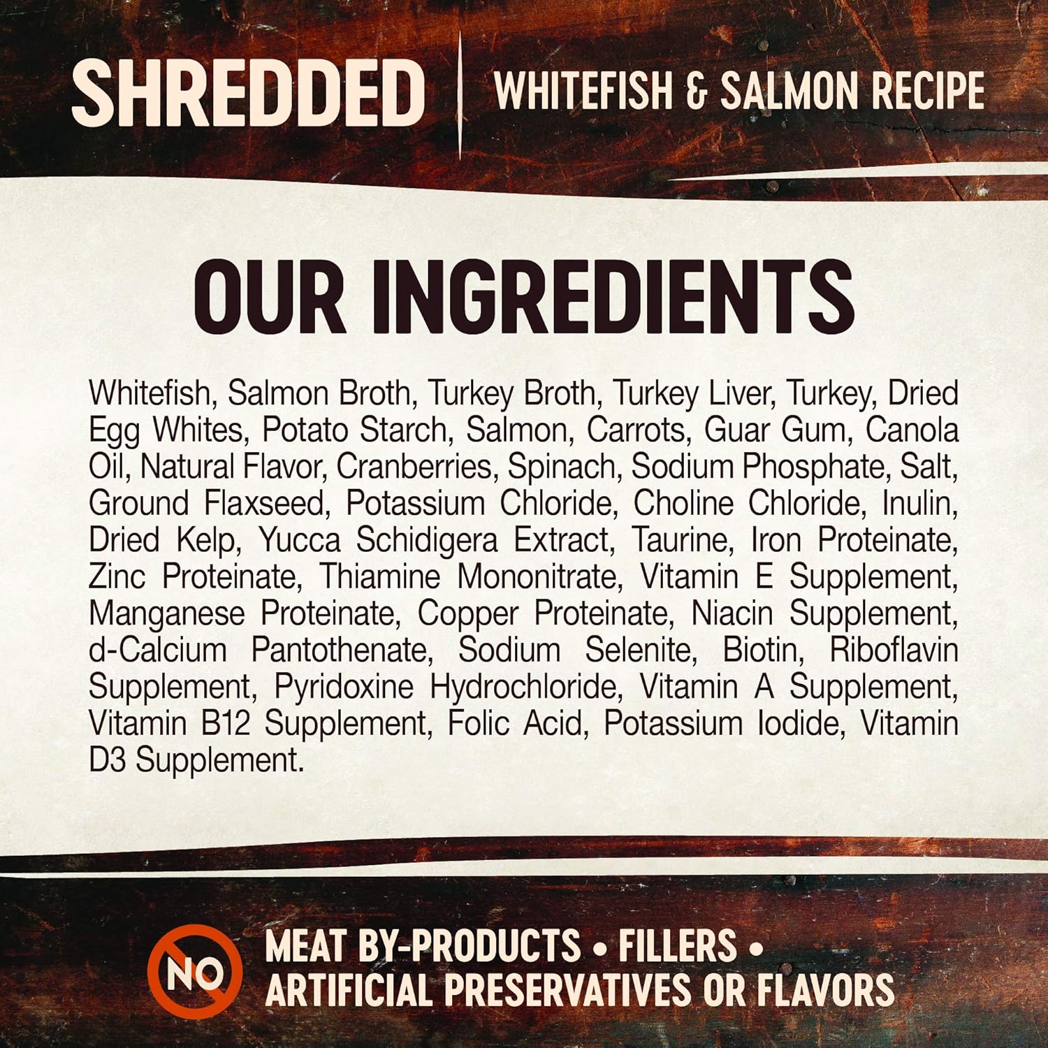 SHREDDED WHITEFISH & SALMON: This natural, grain-free recipe features whitefish and salmon served with a savory, light gravy to satisfy even the most refined palate