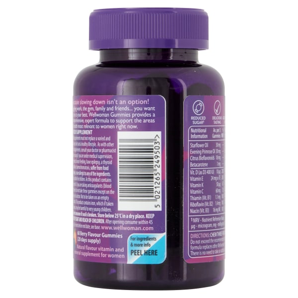 Product Information:For The Woman Who Wants It All, Wellwoman Gummies Provide Comprehensive Nutritional Support With 22 Nutrients. Including Vitamin C And B12 Contribute To Normal Energy Release. Suitable For Vegans,Features:Because Slowing Down IsnāT An Option. Juggling Work, The Gym, Family And Friendsā¦.You Want To Be At Your Best. Wellwoman Gummies Provide A Comprehensive Expert Formula To Support The Areas Of Health Most Important To Women Right Now. With 22 Nutrients In A Delicious Tasting, Natural Berry Flavour Chewable Gummy, Wellwoman Gummies Are Ideal For Those Who DonāT Like Swallowing Tablets. The Gummies Are An Easy And Delicious Way To Help Maintain The Health In Women Of All Ages And Are Suitable For Vegans Too. Energy Release, Health And Vitality: Wellwoman Gummies Have Been Designed For The Demands Of Modern Life With A Spectrum Of Micronutrients For All-Round Nutritional Support Including Vitamins C And B12 And Iron Which Contribute To Normal Energy Release. Folic Acid, Pantothenic Acid And Vitamin B12 Also Contribute To The Reduction Of Tiredness And Fatigue. Unlike General Multivitamins, They Have Safe Nutrient Levels Formulated Especially For Women. Female Health: Wellwoman Gummies Include Evening Primrose And Starflower Oils. They Also Provide Vitamin B6 Which Contributes To The Regulation Of Hormonal Activity, Plus Iron Which Contributes To The Normal Formation Of Red Blood Cells And Haemoglobin, An Important Consideration During The Monthly Cycle. In Addition, 400µg Folic Acid Is Included At The Exact Level Recommended By The Department Of Health, Important For Women Of Child-Bearing Age If They Are Planning A Pregnancy Or ThereāS A Change You Might Get Pregnant. Immune System: Looking After Your Immune Health Is Important Throughout The Year, Not Only In The Winter Months. Wellwoman Gummies Includes Selenium And Zinc Which Contribute To The Normal Function Of The Immune System. They Also Provide 10 µg Vitamin D, The Level Recommended By The Uk Department Of Health. Vitamin B6 And B12 Also Contribute To The Normal Functioning Of The Nervous System. Skin, Hair &Amp; Nails: Most Of Us Would Like A Little Extra Support For Our Skin, Hair And Nails. Vitamin C Is Included In The Wellwoman Gummies Formulation As It Contributes To Normal Collagen Formation For The Normal Function Of Skin. Collagen Is The Substance That Gives Skin Its Elasticity. Plus Biotin, Niacin (Vit. B3), Riboflavin (Vit. B2) And Zinc All Contribute To The Maintenance Of Normal Skin. Zinc Also Contributes To The Maintenance Of Normal Nails And Biotin Contributes To The Maintenance Of Normal Hair. Reduced Sugar: Wellwoman Gummies Contain No Artificial Sweeteners, Colours, Or Flavours. At Vitabiotics We Choose Not To Use Artificial āSugar Freeā Sweeteners Because We Believe ItāS Best To Use Natural Sweeteners, Colours And Flavours In Our Gummies. So, While We Do Use Sugar, Unlike Many Gummy Supplement Products, Wellwoman Gummies Have Reduced Sugar When Compared To A Typical Full Glucose Sugar Gummy. Scientific Formulation: Based On The Latest Scientific Research, Wellwoman Has Been Developed By A Team Of Scientific Experts,Warning Or Restrictions:Food Supplements Must Not Replace A Varied And Balanced Diet And A Healthy Lifestyle. As With Other Food Supplements, Consult Your Doctor Or Pharmacist Before Using If You Are Under Medical Supervision, Have Epilepsy, A Thyroid Condition, Haemochromatosis, Suffer From Food Allergies, Or Are Allergic To Any Of The Ingredients. Not Suitable For Children. Not To Be Taken On An Empty Stomach. This Product Contains Iron, Which If Taken In Excess, May Be Harmful To Very Young Children,Product Specification:Wheat Glucose Syrup, Sugar, Fructooligosaccharides, Gelling Agent: Fruit Pectin, Vitamin And Nutrient Blend (Citrus Bioflavonoids, Niacin [As Nicotinamide], Ferric Pyrophosphate, Sodium Selenite, Zinc Citrate, Pantothenic Acid, Potassium Iodide, Vitamin D3 [Cholecalciferol (Vegan)], Vitamin B6 [As Pyridoxine Hci], Vitamin B1 [As Thiamin Hci], Riboflavin, Vitamin B12 [As Cyanocobalamin], Vitamin K [As Vitamin K1], Copper Citrate, Folic Acid, Chromium Picolinate, Biotin), Acidity Regulators: Citric Acid &Amp; Sodium Citrate, Vitamin C [Ascorbic Acid], Black Carrot Juice Concentrate, Vitamin E [As D-Alpha Tocopheryl Acetate], Starflower Oil, Evening Primrose Oil, Blueberry Flavouring, Strawberry Flavouring, Antioxidant: Mixed Tocopherols, Coating: Vegetable Oils (Coconut Oil, Rape Seed Oil), Glazing Agent (Carnauba Wax) And Antioxidant (Alpha Tocopherol), Betacarotene,Product Uses:Chew Three Gummies Per Day With Your Main Meal. Do Not Exceed The Recommended Intake. This Comprehensive Formula Replaces Other Wellman Multivitamins. There Is No Need To Take An Additional Multivitamin