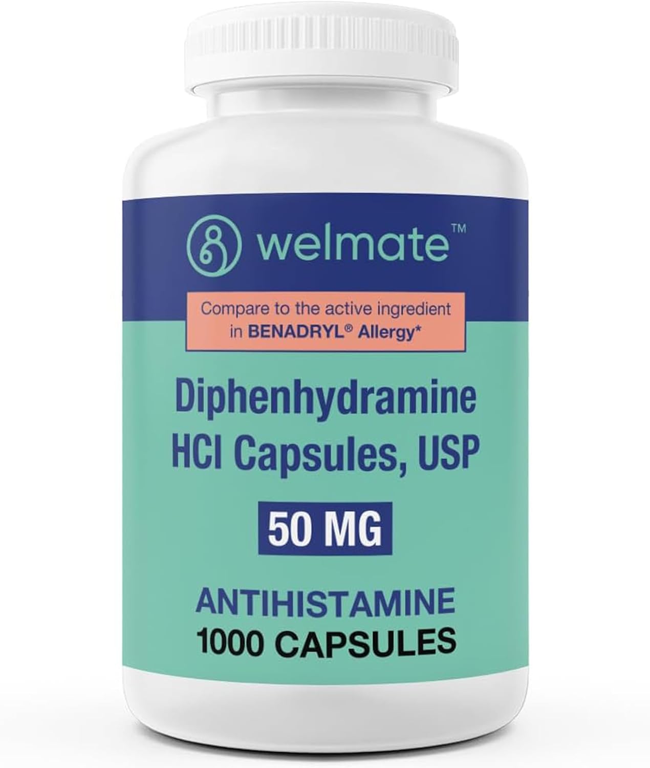 Welmate Allergy Relief | Diphenhydramine 50 Mg | 1000 Count Capsules | Antihistamine - Non-Drowsy Relief - Allergy & Cold Symptoms - Sneezing, Runny Nose, Itchy Eyes & Throat