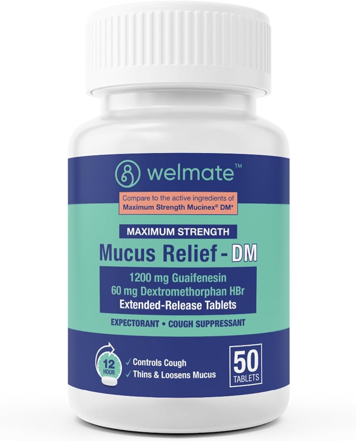 Welmate Maximum Strength Mucus Relief Dm - 1200Mg Guaifenesin & 60Mg Dxm, 12-Hr Cough Suppressant & Expectorant, Bi-Layer Tablets, Chest Congestion Relief, Thins & Loosens Mucus - 50 Ct