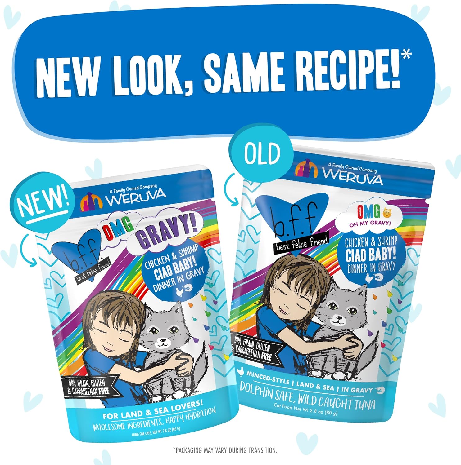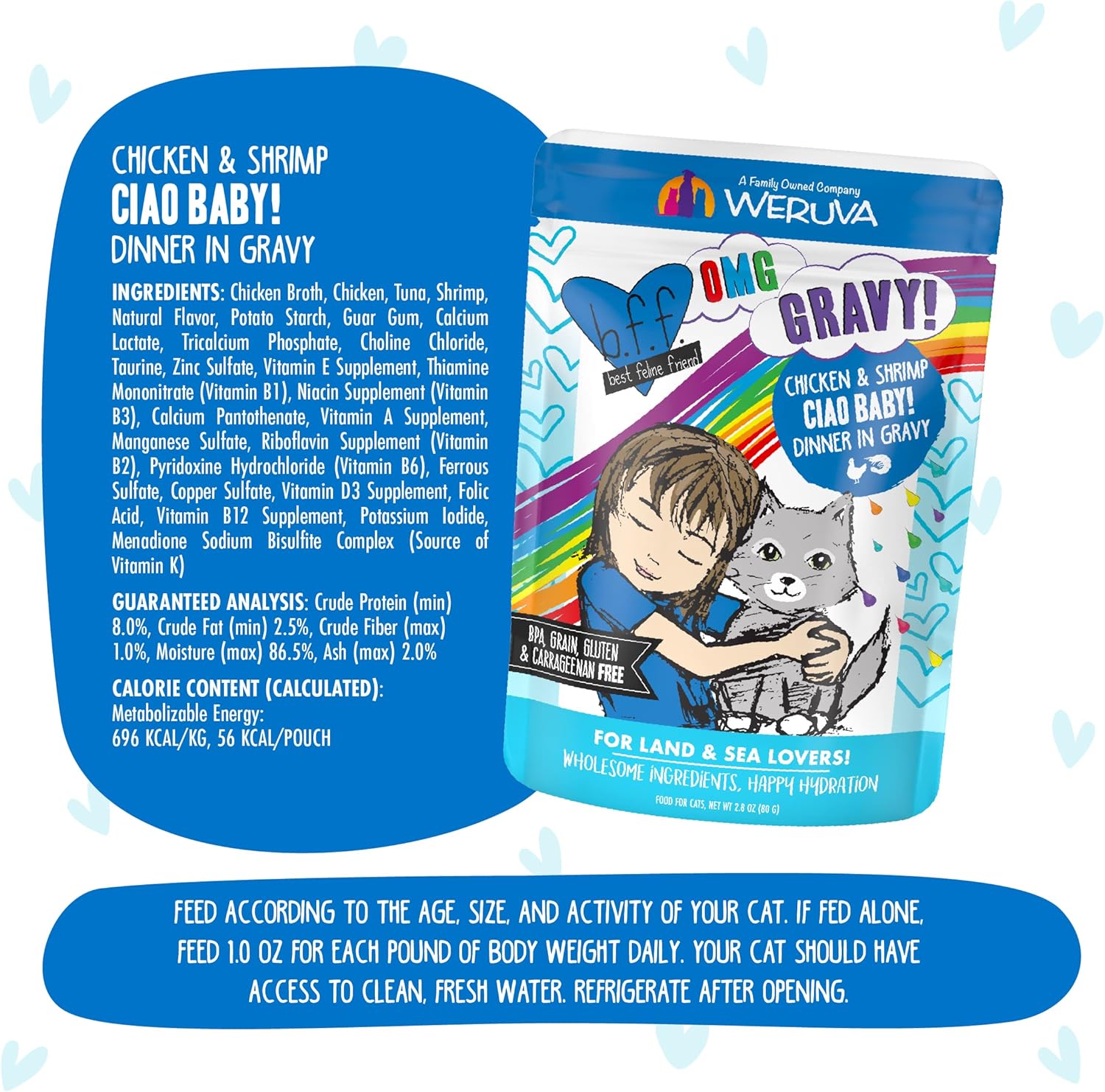 Weruva B.F.F. Omg - Best Feline Friend Oh My Gravy!, Ciao Baby! With Chicken & Shrimp In Gravy Cat Food, 2.8Oz Pouch (Pack Of 12)