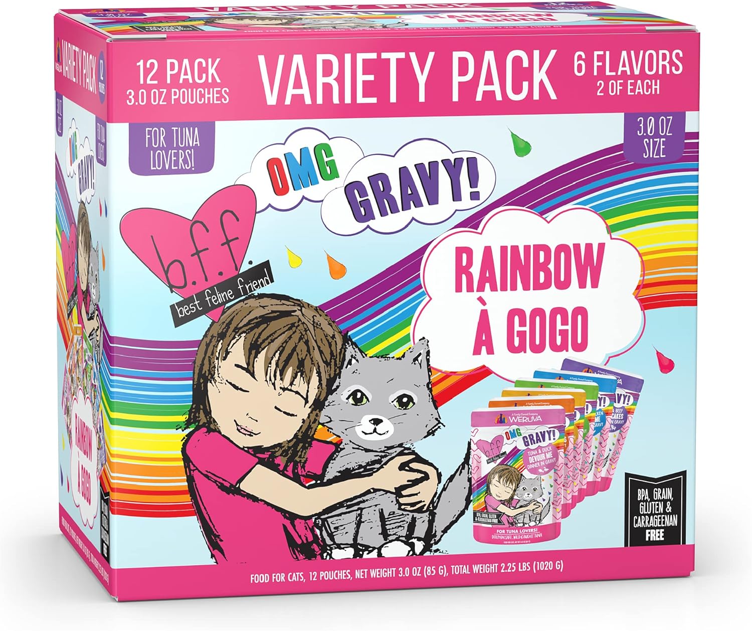 Weruva B.F.F. Omg - Best Feline Friend Oh My Gravy!, Rainbow A Gogo Variety Pack! Cat Food, 3Oz Pouch (Pack Of 12)