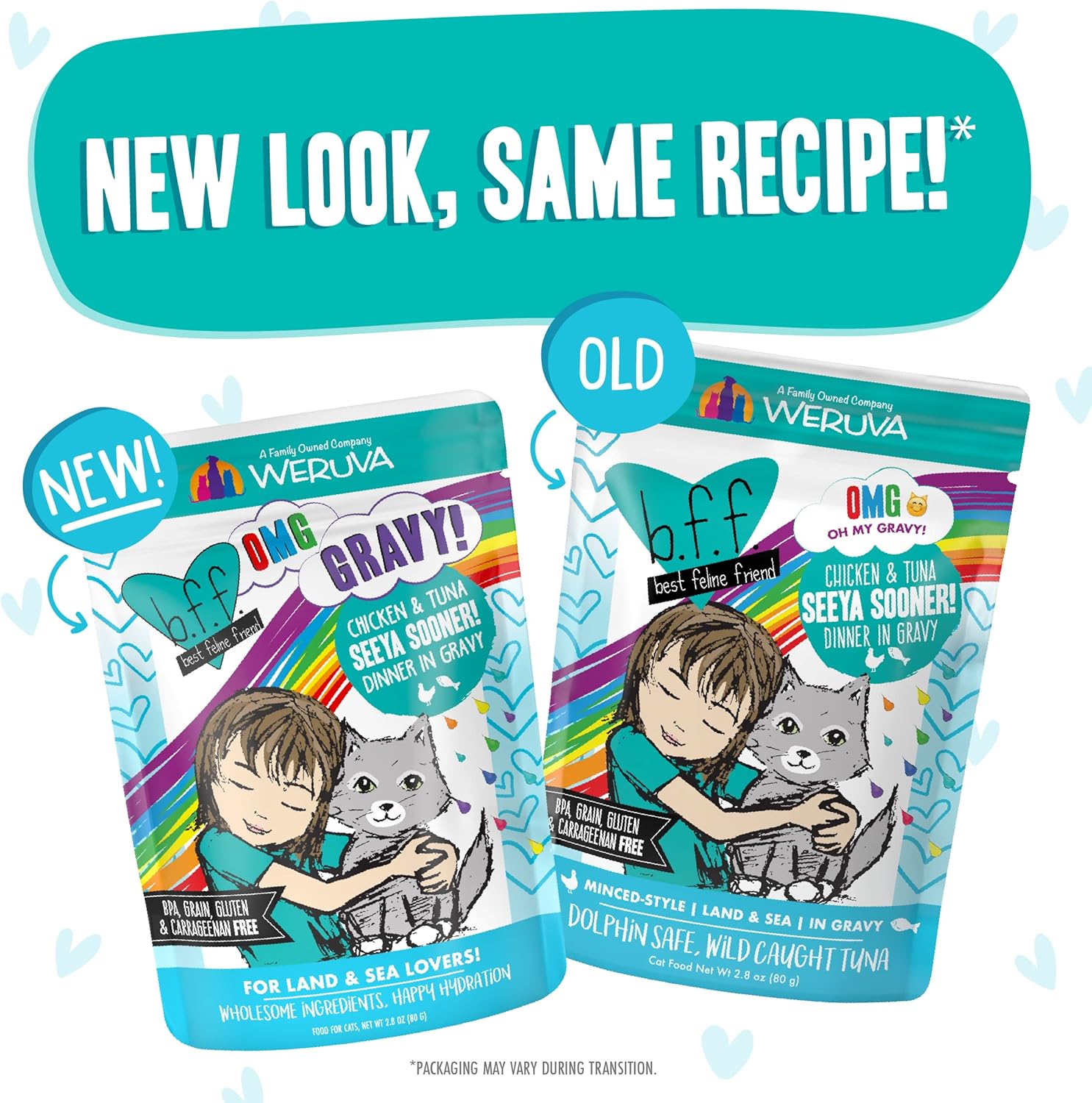 Weruva B.F.F. Omg - Best Feline Friend Oh My Gravy!, Seeya Sooner! With Chicken & Tuna In Gravy Cat Food, 2.8Oz Pouch (Pack Of 12)