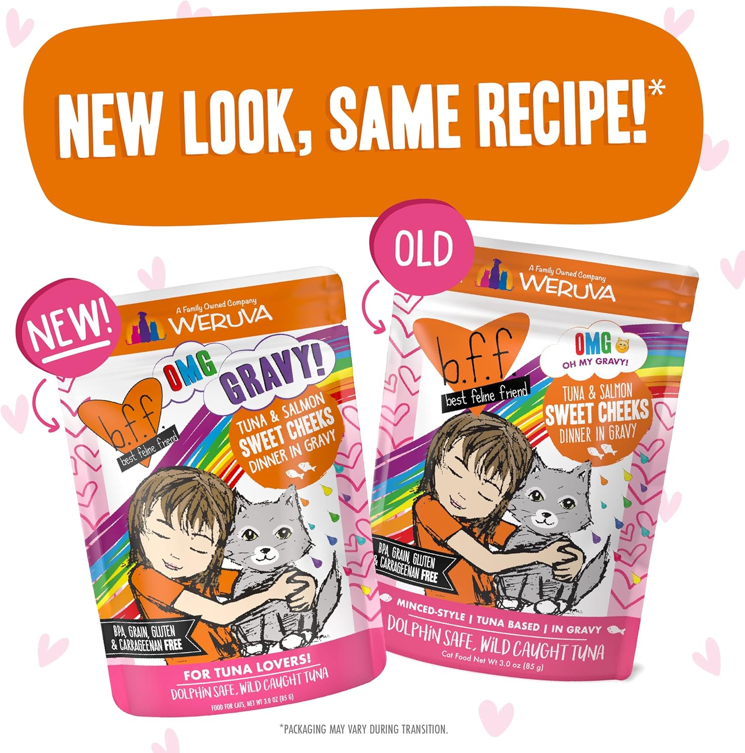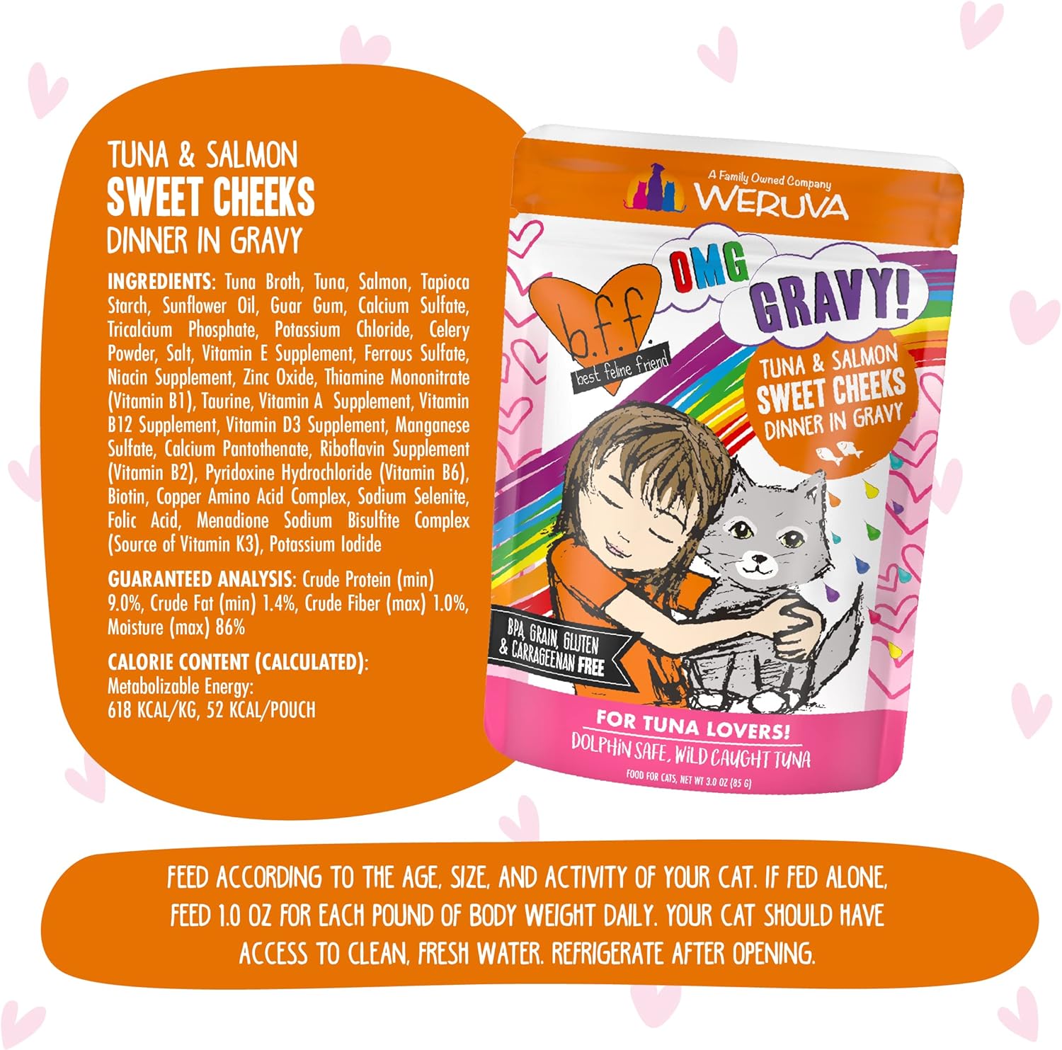 Weruva B.F.F. Omg - Best Feline Friend Oh My Gravy!, Tuna & Salmon Sweet Cheeks With Tuna & Salmon In Gravy Cat Food, 3Oz Pouch (Pack Of 12)