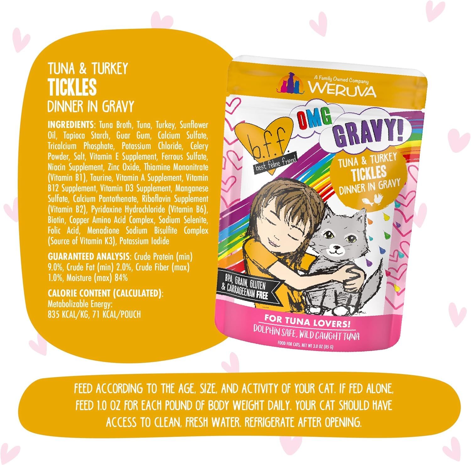 Weruva B.F.F. Omg - Best Feline Friend Oh My Gravy!, Tuna & Turkey Tickles With Tuna & Turkey In Gravy Cat Food, 3Oz Pouch (Pack Of 12)