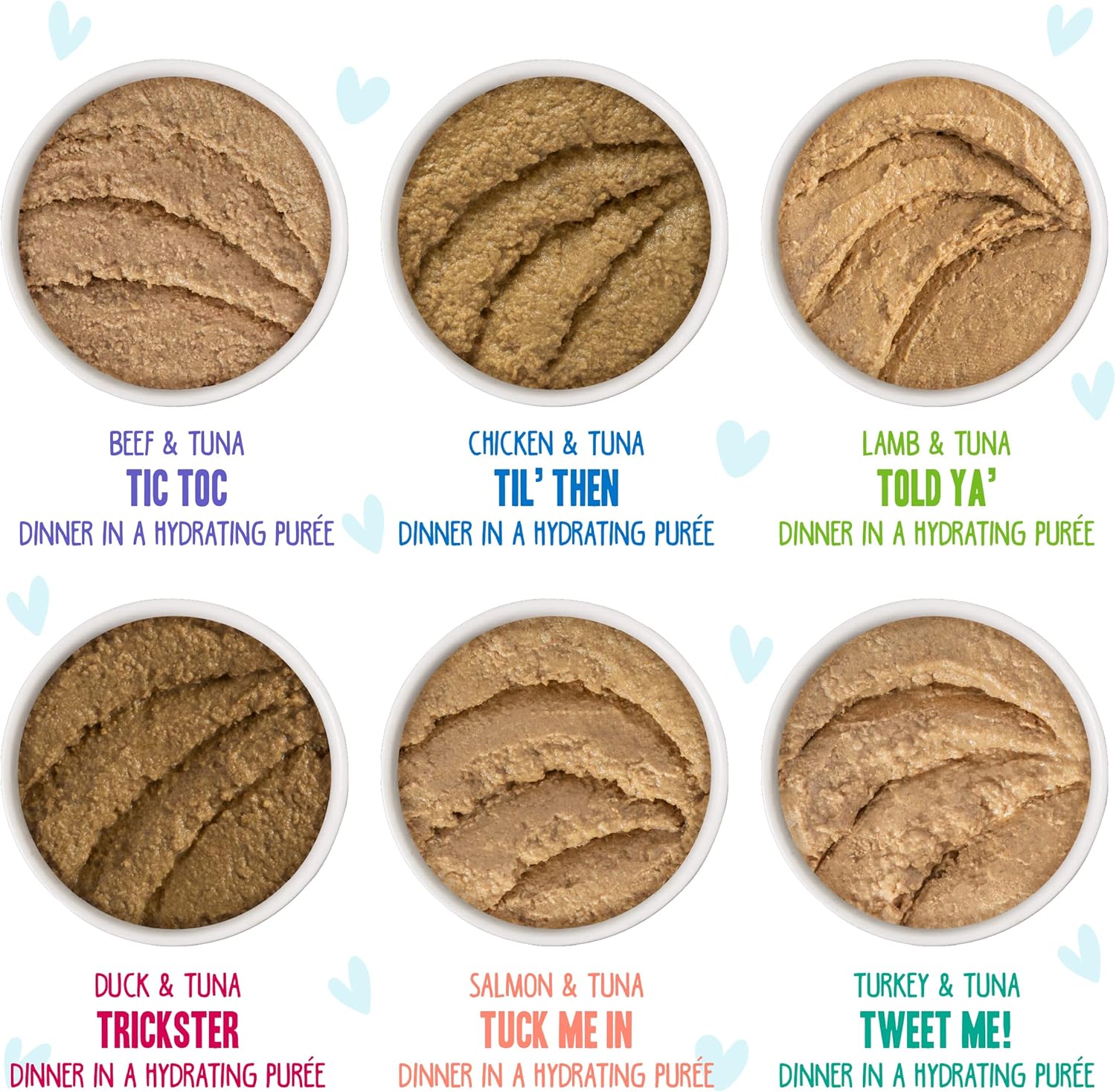 Variety Pack Includes: Chicken & Tuna Til' Then, Salmon & Tuna Tuck Me In, Beef & Tuna Tic Toc, Duck & Tuna Trickster, Turkey & Tuna Tweet Me, & Lamb & Tuna Told Ya