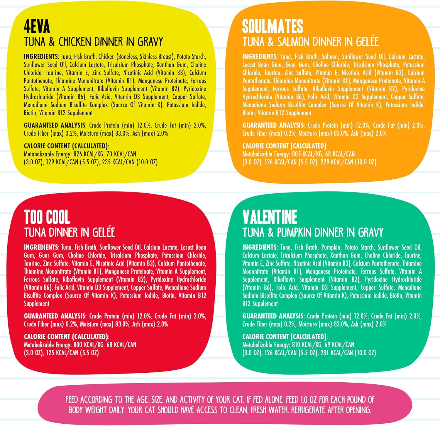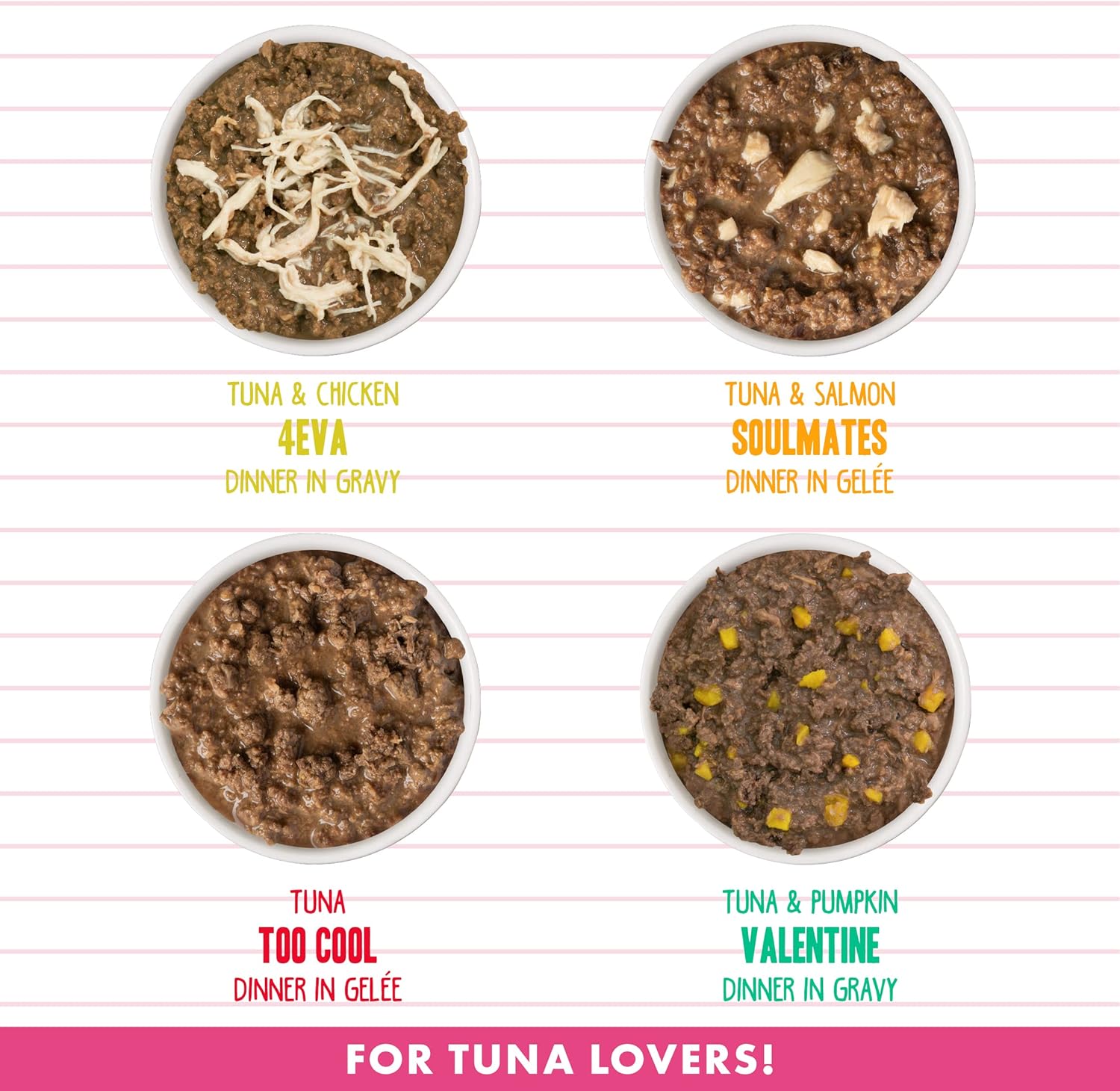 Variety Pack Includes 3 Of Each: Tuna & Chicken 4Eva, Tuna & Pumpkin Valentine, Tuna & Salmon Soulmates And Tuna Too Cool!