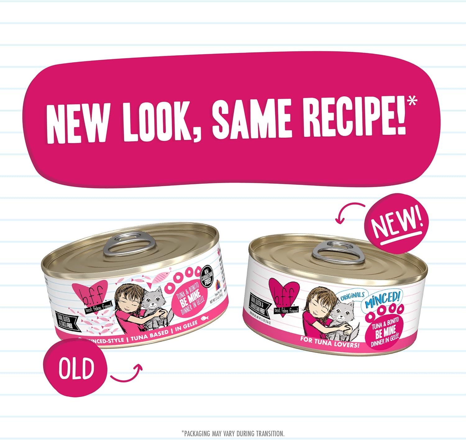 B.F.F., Best Friends Foods, Best Feline Friend Or Best Friends Forever Our Foods Are Just That The Best You Can Get For Your Furry Little Feline Purr Machine! With A High Quality Protein Focus And Limited Carbohydrates, Your Kitty Will Enjoy BffâS Grain Free, Low Fat Recipes That Also Deliver The High Moisture Your Cat Needs. If Your Cat Is Your Bff, Then Feed Them The Best Feline Food! Super-Safe People Food Processing Standards - Bff Is Produced In A Facility That Also Produces Food For People. The Factory Operates At International Human Food Processing Standards, Including That Of The Super-Strict British Retail Consortium (Brc), And The Pet Food Processing Must Pass Brc Scrutiny. The Ingredients - The Main Ingredient Is A Red Meat Or Dark Meat From Tuna, Primarily Skipjack Or Bonito, Two Smaller And Highly Sustainable Species. The Cuts Contain Lean Muscle Meat And Have A Taste And Aroma That Drives Kitties Wild! Amongst The Various Flavors, We Include Value Added Toppers Such As Boneless Skinless Chicken Breast, Duck, Lamb, Salmon, Shrimp And Pumpkin. Wild Caught And Dolphin Safe - And Speaking Of Kitties Going Wild For Bff, All Of The Fish Used Is Wild Caught, With The Exception Of Tilapia. The Catches Of Fish Are Also Certified To Have Been Safe For Dolphins And Turtles, As Certified By The Shipsâ Captains. The Textures - Gravy And Aspic . Bff Is Available In Cans And Pouches, And All Flavors Deliver High Moisture. The Cans Come In Both Gravy And Aspic, And The Pouches Are All In Gravy. The Gravy Is What YouâD Expect It To Besimply Cat-Tastic For Those Kitties That Love To Lick! The Aspic Is Similar To Jell-O In That It Starts Off As A Powder That Is Mixed With Water, But When Cooked, It Takes On A Gel Like Substance. It Is Great For âProtectingâ The Ingredients In That You Are Able To See And Identify The Ingredients That We Use. The Family - Bff Is Made By Weruva And Is Still Proud To Be Family Owned & Operated By David & Stacie Forman After Over 10 Years Of Making High Quality Pet Products! Your Cat Will Love Our Bff Grain-Free Formulas! Bff Tuna & Bonito Be Mine Canned Food Features Wild-Caught, Hand-Flaked Off The Bone Red-Meat Skipjack Tuna With Wild-Caught Bonito In A Delicious Jelly Called Aspic.Guaranteed Analysis:Crude Protein (Min) 12.0%, Crude Fat (Min) 2.0%, Crude Fiber (Max) 0.2%, Moisture (Max) 83.0%, Ash (Max) 2.0%, Taurine (Min) 0.05%, Phosphorus (Max) 0.20%Aafco Statement:This Cat Food Is Formulated To Meet Nutritional Levels Established By The Aafco Cat Food Nutrient Profiles For Adult Maintenance