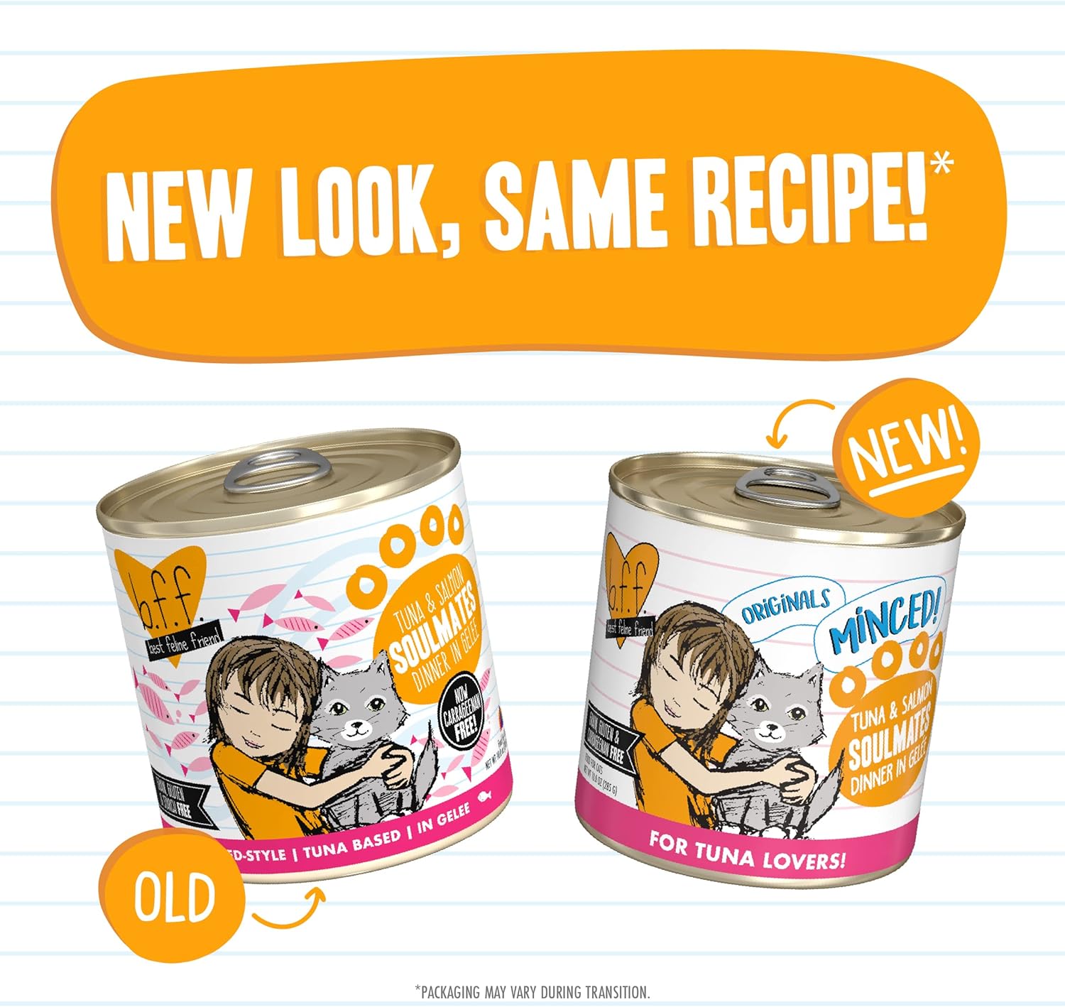 B.F.F., Best Friends Foods, Best Feline Friend Or Best Friends Forever Our Foods Are Just That The Best You Can Get For Your Furry Little Feline Purr Machine! With A High Quality Protein Focus And Limited Carbohydrates, Your Kitty Will Enjoy BffâS Grain Free, Low Fat Recipes That Also Deliver The High Moisture Your Cat Needs. If Your Cat Is Your Bff, Then Feed Them The Best Feline Food! Super-Safe People Food Processing Standards - Bff Is Produced In A Facility That Also Produces Food For People. The Factory Operates At International Human Food Processing Standards, Including That Of The Super-Strict British Retail Consortium (Brc), And The Pet Food Processing Must Pass Brc Scrutiny. The Ingredients - The Main Ingredient Is A Red Meat Or Dark Meat From Tuna, Primarily Skipjack Or Bonito, Two Smaller And Highly Sustainable Species. The Cuts Contain Lean Muscle Meat And Have A Taste And Aroma That Drives Kitties Wild! Amongst The Various Flavors, We Include Value Added Toppers Such As Boneless Skinless Chicken Breast, Duck, Lamb, Salmon, Shrimp And Pumpkin. Wild Caught And Dolphin Safe - And Speaking Of Kitties Going Wild For Bff, All Of The Fish Used Is Wild Caught, With The Exception Of Tilapia. The Catches Of Fish Are Also Certified To Have Been Safe For Dolphins And Turtles, As Certified By The Shipsâ Captains. The Textures - Gravy And Aspic . Bff Is Available In Cans And Pouches, And All Flavors Deliver High Moisture. The Cans Come In Both Gravy And Aspic, And The Pouches Are All In Gravy. The Gravy Is What YouâD Expect It To Besimply Cat-Tastic For Those Kitties That Love To Lick! The Aspic Is Similar To Jell-O In That It Starts Off As A Powder That Is Mixed With Water, But When Cooked, It Takes On A Gel Like Substance. It Is Great For âProtectingâ The Ingredients In That You Are Able To See And Identify The Ingredients That We Use. The Family - Bff Is Made By Weruva And Is Still Proud To Be Family Owned & Operated By David & Stacie Forman After Over 10 Years Of Making High Quality Pet Products! Your Cat Will Love Our Bff Grain-Free Formulas! Bff Tuna & Salmon Soulmates Canned Food Features Wild-Caught, Hand-Flaked Off The Bone Red-Meat Skipjack Tuna With Wild-Caught Salmon In A Delicious Jelly Called Aspic. Guaranteed Analysis: Crude Protein (Min) 12.0%, Crude Fat (Min) 2.0%, Crude Fiber (Max) 0.2%, Moisture (Max) 83%, Ash (Max) 2.0%, Taurine (Min) 0.05%, Phosphorus (Max) 0.20% Aafco Statement: This Cat Food Is Formulated To Meet Nutritional Levels Established By The Aafco Cat Food Nutrient Profiles For Adult Maintenance