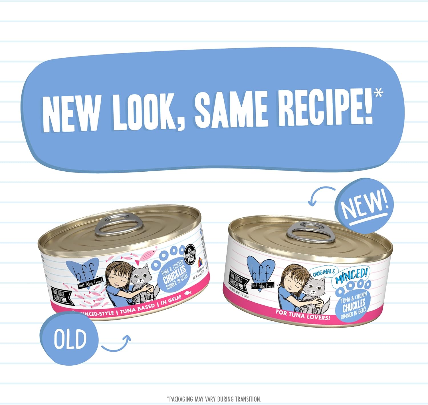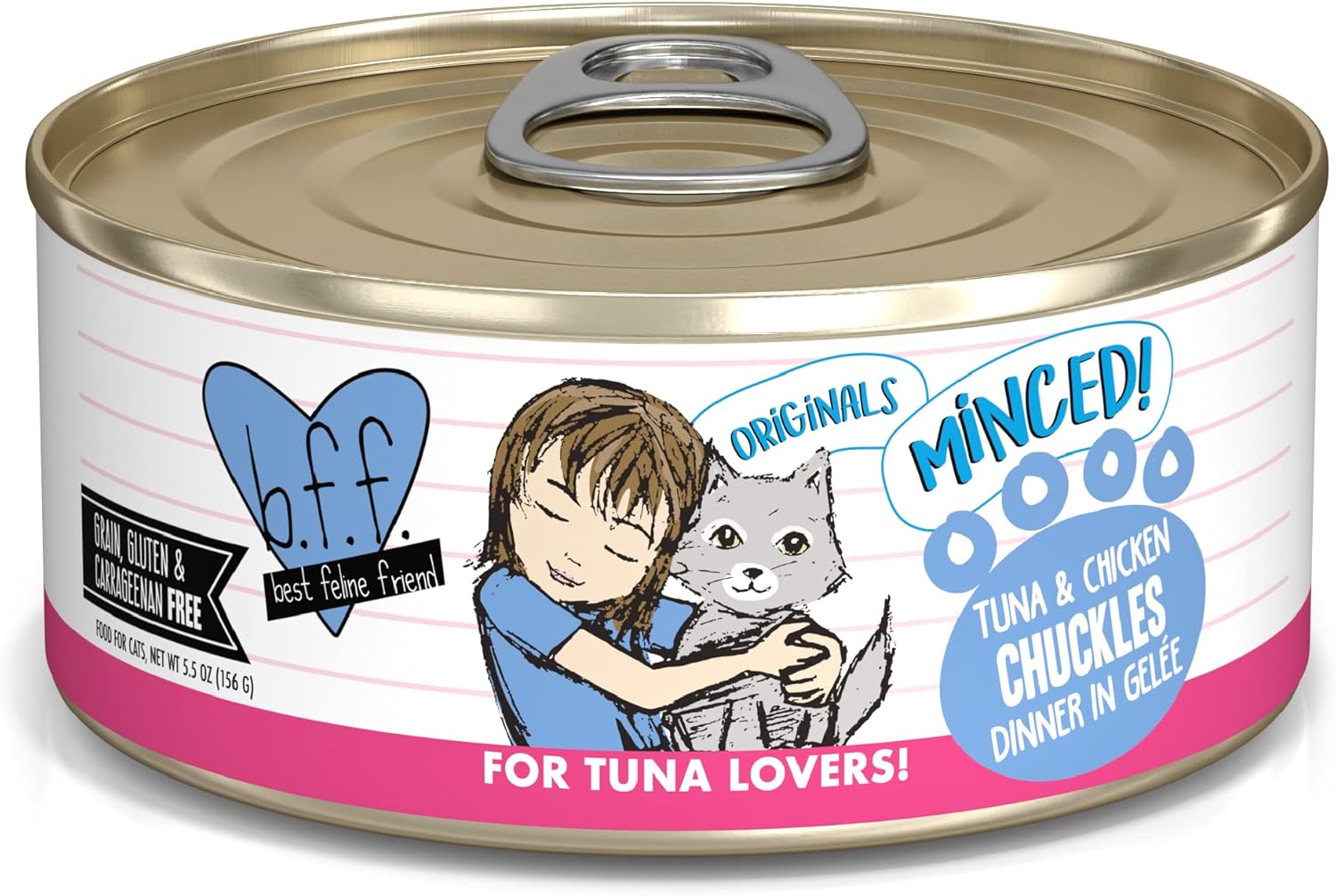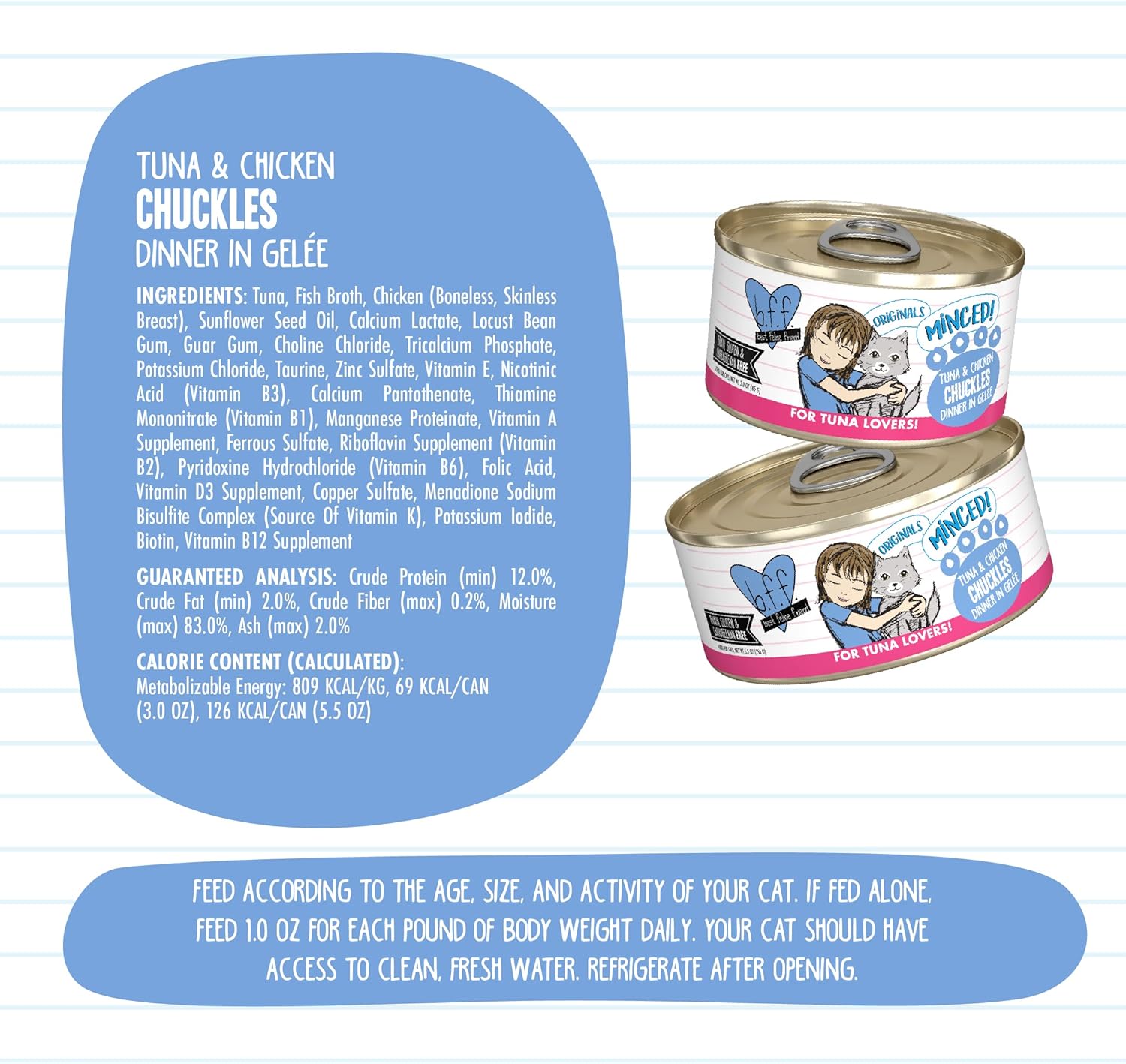 B.F.F., Best Friends Foods, Best Feline Friend Or Best Friends Forever Our Foods Are Just That The Best You Can Get For Your Furry Little Feline Purr Machine! With A High Quality Protein Focus And Limited Carbohydrates, Your Kitty Will Enjoy Bff’S Grain Free, Low Fat Recipes That Also Deliver The High Moisture Your Cat Needs. If Your Cat Is Your Bff, Then Feed Them The Best Feline Food! Super-Safe People Food Processing Standards - Bff Is Produced In A Facility That Also Produces Food For People. The Factory Operates At International Human Food Processing Standards, Including That Of The Super-Strict British Retail Consortium (Brc), And The Pet Food Processing Must Pass Brc Scrutiny. The Ingredients - The Main Ingredient Is A Red Meat Or Dark Meat From Tuna, Primarily Skipjack Or Bonito, Two Smaller And Highly Sustainable Species. The Cuts Contain Lean Muscle Meat And Have A Taste And Aroma That Drives Kitties Wild! Amongst The Various Flavors, We Include Value Added Toppers Such As Boneless Skinless Chicken Breast, Duck, Lamb, Salmon, Shrimp And Pumpkin. Wild Caught And Dolphin Safe - And Speaking Of Kitties Going Wild For Bff, All Of The Fish Used Is Wild Caught, With The Exception Of Tilapia. The Catches Of Fish Are Also Certified To Have Been Safe For Dolphins And Turtles, As Certified By The Ships’ Captains. The Textures - Gravy And Aspic . Bff Is Available In Cans And Pouches, And All Flavors Deliver High Moisture. The Cans Come In Both Gravy And Aspic, And The Pouches Are All In Gravy. The Gravy Is What You’D Expect It To Be Simply Cat-Tastic For Those Kitties That Love To Lick! The Aspic Is Similar To Jell-O In That It Starts Off As A Powder That Is Mixed With Water, But When Cooked, It Takes On A Gel Like Substance. It Is Great For “Protecting” The Ingredients In That You Are Able To See And Identify The Ingredients That We Use. The Family - Bff Is Made By Weruva And Is Still Proud To Be Family Owned & Operated By David & Stacie Forman After Over 10 Years Of Making High Quality Pet Products! Your Cat Will Love Our Bff Grain-Free Formulas! Bff Tuna & Chicken Chuckles Canned Food Features Wild-Caught, Hand-Flaked Off The Bone Red-Meat Skipjack Tuna With Cage-Free Boneless, Skinless Chicken Breast In A Delicious Jelly Called Aspic.Guaranteed Analysis:Crude Protein (Min) 12.0%, Crude Fat (Min)2.0%, Crude Fiber (Max) 0.2%, Moisture (Max) 83.0%, Ash (Max) 2.0%, Taurine (Min) 0.05%, Phosphorus (Max) 0.20%Aafco Statement:This Cat Food Is Formulated To Meet Nutritional Levels Established By The Aafco Cat Food Nutrient Profiles For Adult Maintenance