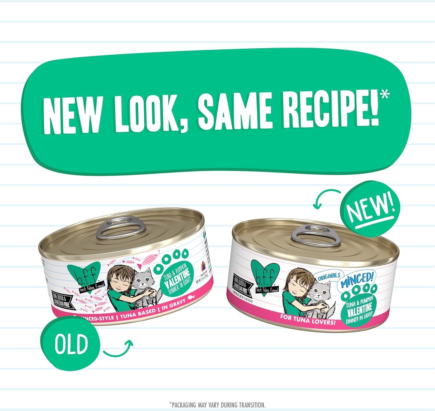 B.F.F., Best Friends Foods, Best Feline Friend Or Best Friends Forever Our Foods Are Just That The Best You Can Get For Your Furry Little Feline Purr Machine! With A High Quality Protein Focus And Limited Carbohydrates, Your Kitty Will Enjoy BffâS Grain Free, Low Fat Recipes That Also Deliver The High Moisture Your Cat Needs. If Your Cat Is Your Bff, Then Feed Them The Best Feline Food! Super-Safe People Food Processing Standards - Bff Is Produced In A Facility That Also Produces Food For People. The Factory Operates At International Human Food Processing Standards, Including That Of The Super-Strict British Retail Consortium (Brc), And The Pet Food Processing Must Pass Brc Scrutiny. The Ingredients - The Main Ingredient Is A Red Meat Or Dark Meat From Tuna, Primarily Skipjack Or Bonito, Two Smaller And Highly Sustainable Species. The Cuts Contain Lean Muscle Meat And Have A Taste And Aroma That Drives Kitties Wild! Amongst The Various Flavors, We Include Value Added Toppers Such As Boneless Skinless Chicken Breast, Duck, Lamb, Salmon, Shrimp And Pumpkin. Wild Caught And Dolphin Safe - And Speaking Of Kitties Going Wild For Bff, All Of The Fish Used Is Wild Caught, With The Exception Of Tilapia. The Catches Of Fish Are Also Certified To Have Been Safe For Dolphins And Turtles, As Certified By The Shipsâ Captains. The Textures - Gravy And Aspic . Bff Is Available In Cans And Pouches, And All Flavors Deliver High Moisture. The Cans Come In Both Gravy And Aspic, And The Pouches Are All In Gravy. The Gravy Is What YouâD Expect It To Be Simply Cat-Tastic For Those Kitties That Love To Lick! The Aspic Is Similar To Jell-O In That It Starts Off As A Powder That Is Mixed With Water, But When Cooked, It Takes On A Gel Like Substance. It Is Great For âProtectingâ The Ingredients In That You Are Able To See And Identify The Ingredients That We Use. The Family - Bff Is Made By Weruva And Is Still Proud To Be Family Owned & Operated By David & Stacie Forman After Over 10 Years Of Making High Quality Pet Products! Your Cat Will Love Our Bff Grain-Free Formulas! Bff Tuna & Pumpkin Valentine Canned Food Features Wild-Caught, Hand-Flaked Off The Bone Red-Meat Skipjack Tuna With Pumpkin In A Delicious Gravy.Guaranteed Analysis:Crude Protein (Min) 12.0%, Cured Fat (Min) 2.0%, Crude Fiber (Max) 02%, Moisture (Max) 83%, Ash (Max) 2.0%, Taurine (Min) 0.05%, Phosphorus (Max) 0.20%Aafco Statement:This Cat Food Is Formulated To Meet Nutritional Levels Established By The Aafco Cat Food Nutrient Profiles For Adult Maintenance