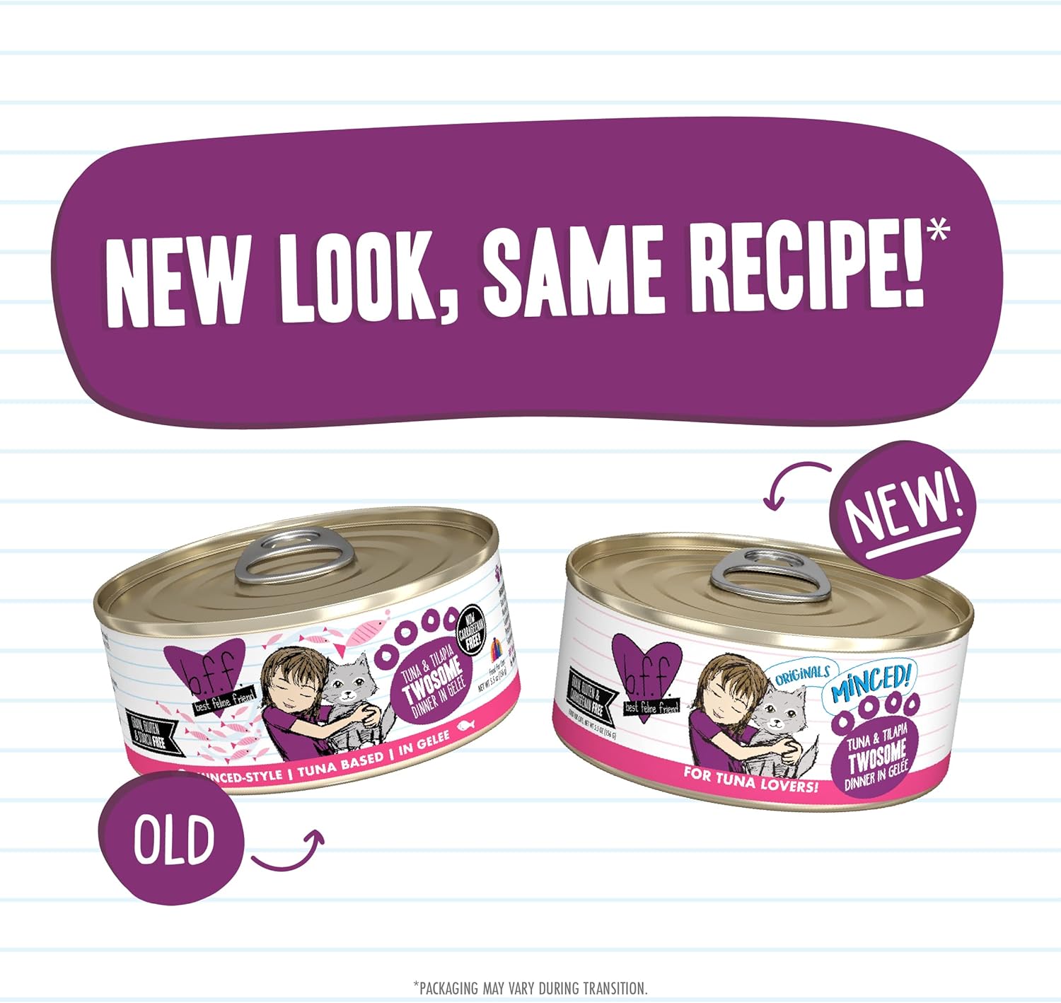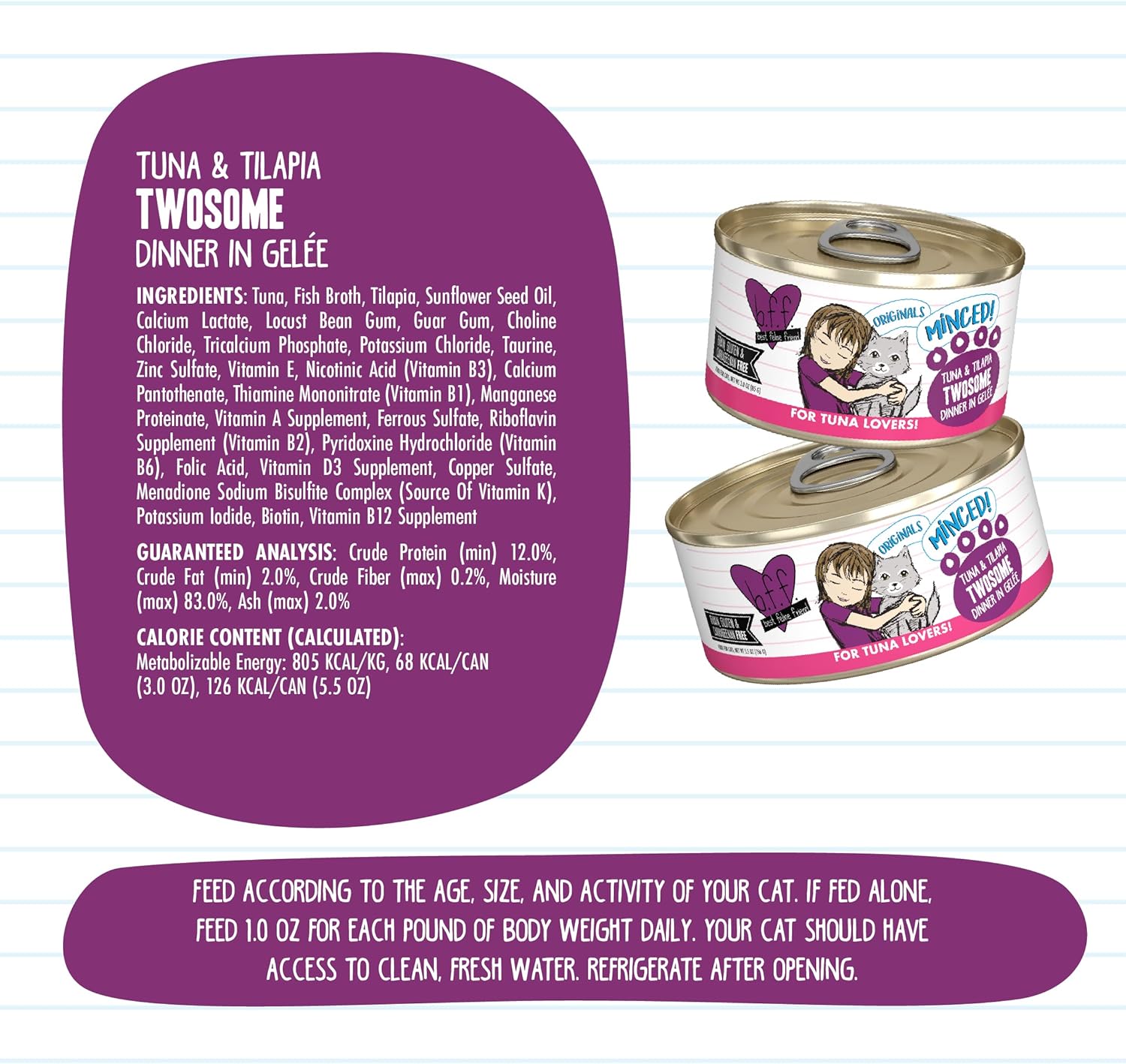 B.F.F., Best Friends Foods, Best Feline Friend Or Best Friends Forever Our Foods Are Just That The Best You Can Get For Your Furry Little Feline Purr Machine! With A High Quality Protein Focus And Limited Carbohydrates, Your Kitty Will Enjoy Bff’S Grain Free, Low Fat Recipes That Also Deliver The High Moisture Your Cat Needs. If Your Cat Is Your Bff, Then Feed Them The Best Feline Food! Super-Safe People Food Processing Standards - Bff Is Produced In A Facility That Also Produces Food For People. The Factory Operates At International Human Food Processing Standards, Including That Of The Super-Strict British Retail Consortium (Brc), And The Pet Food Processing Must Pass Brc Scrutiny. The Ingredients - The Main Ingredient Is A Red Meat Or Dark Meat From Tuna, Primarily Skipjack Or Bonito, Two Smaller And Highly Sustainable Species. The Cuts Contain Lean Muscle Meat And Have A Taste And Aroma That Drives Kitties Wild! Amongst The Various Flavors, We Include Value Added Toppers Such As Boneless Skinless Chicken Breast, Duck, Lamb, Salmon, Shrimp And Pumpkin. Wild Caught And Dolphin Safe - And Speaking Of Kitties Going Wild For Bff, All Of The Fish Used Is Wild Caught, With The Exception Of Tilapia. The Catches Of Fish Are Also Certified To Have Been Safe For Dolphins And Turtles, As Certified By The Ships’ Captains. The Textures - Gravy And Aspic . Bff Is Available In Cans And Pouches, And All Flavors Deliver High Moisture. The Cans Come In Both Gravy And Aspic, And The Pouches Are All In Gravy. The Gravy Is What You’D Expect It To Be Simply Cat-Tastic For Those Kitties That Love To Lick! The Aspic Is Similar To Jell-O In That It Starts Off As A Powder That Is Mixed With Water, But When Cooked, It Takes On A Gel Like Substance. It Is Great For “Protecting” The Ingredients In That You Are Able To See And Identify The Ingredients That We Use. The Family - Bff Is Made By Weruva And Is Still Proud To Be Family Owned & Operated By David & Stacie Forman After Over 10 Years Of Making High Quality Pet Products! Your Cat Will Love Our Bff Grain-Free Formulas! Bff Tuna & Tilapia Twosome Canned Food Features Wild-Caught, Hand-Flaked Off The Bone Red-Meat Skipjack Tuna With Tilapia In A Delicious Jelly Called Aspic.Guaranteed Analysis:Crude Protein (Min) 12.0%, Crude Fat (Min) 2.0%, Crude Fiber (Max) 0.2%, Moisture (Max) 83%, Ash (Max) 2.0%, Taurine (Min) 0.05%, Phosphorus (Max) 0.20%Aafco Statement:This Cat Food Is Formulated To Meet Nutritional Levels Established By The Aafco Cat Food Nutrient Profiles For Adult Maintenance