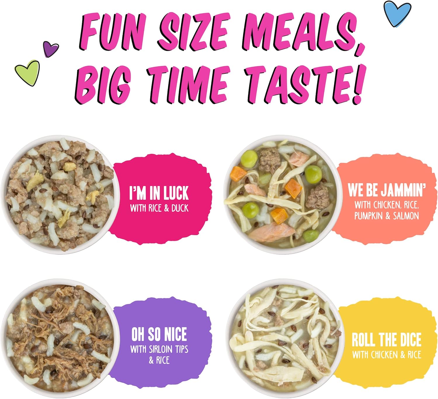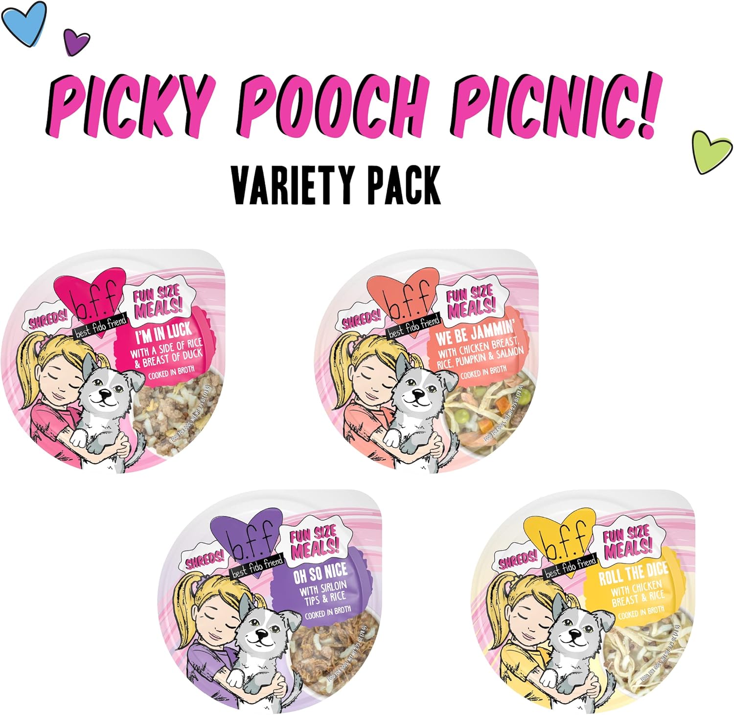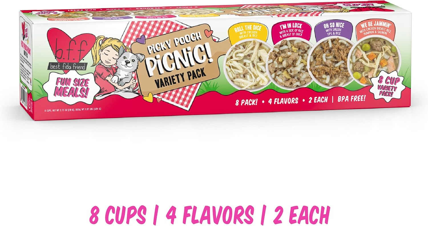 B.F.F. Fun Size Meals, Picky Pooch Picnic Variety Pack. Four tasty recipes with chicken, duck, sirloin tips, salmon, pumpkin & rice cooked in broth for extra yum! 2.75oz Cups (Pack of 8)