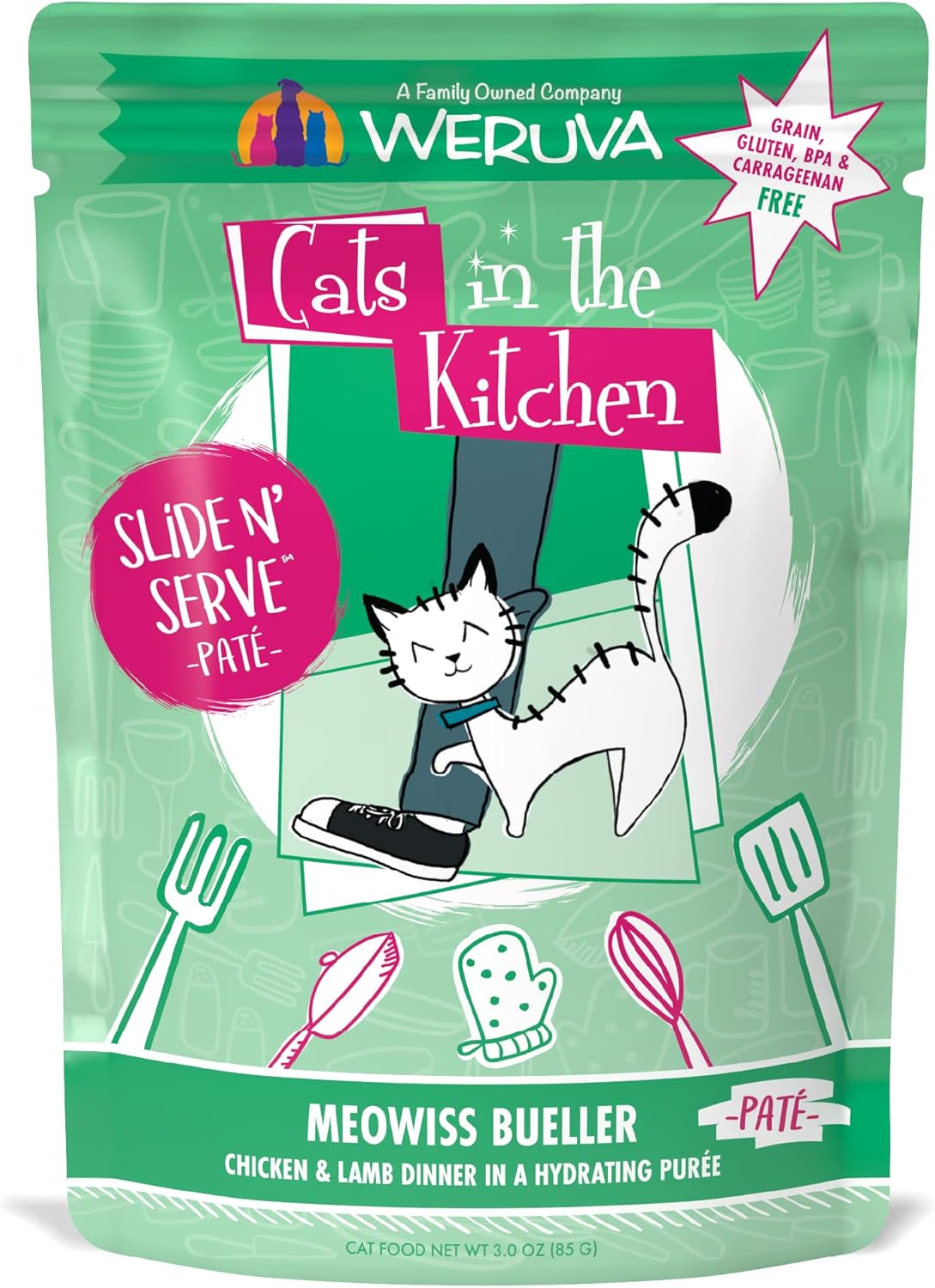 Weruva Cats In The Kitchen Slide N' Serve Grain-Free Natural Wet Pate Cat Food Pouches, Meowiss Bueller, 3Oz Pouch (Pack Of 12)