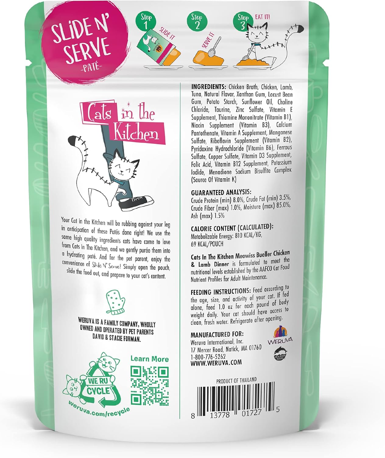 Meowiss Bueller (3Oz Pouch, Pack Of 12) Featuring Cage-Free Chicken, Grass-Fed Lamb, And Real Cuts Of Wild Tuna Gently Pureed Into A Creamy And Delicious Pate. Convenient Slide N' Serve Pouch Makes Meal Time Fun And Easy!