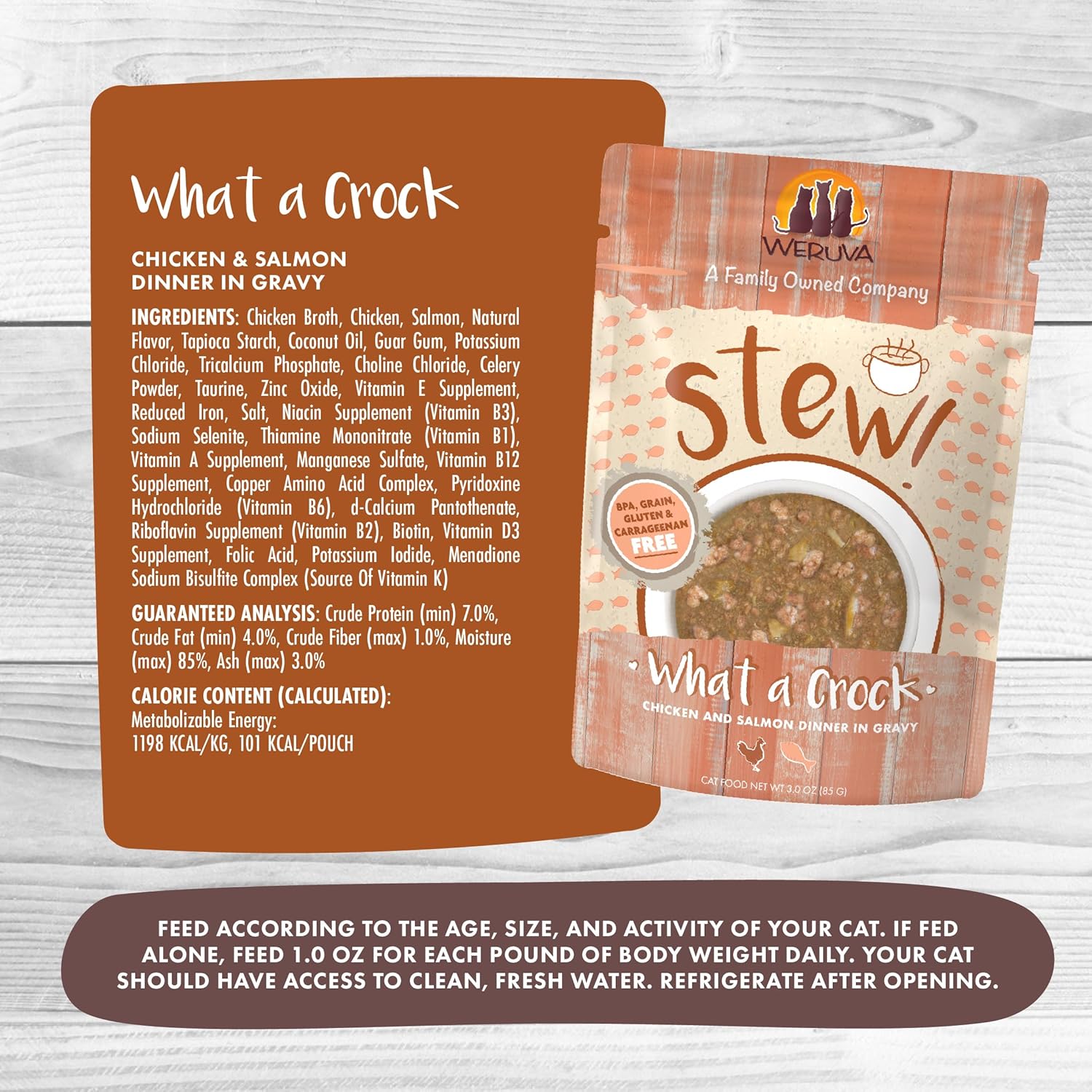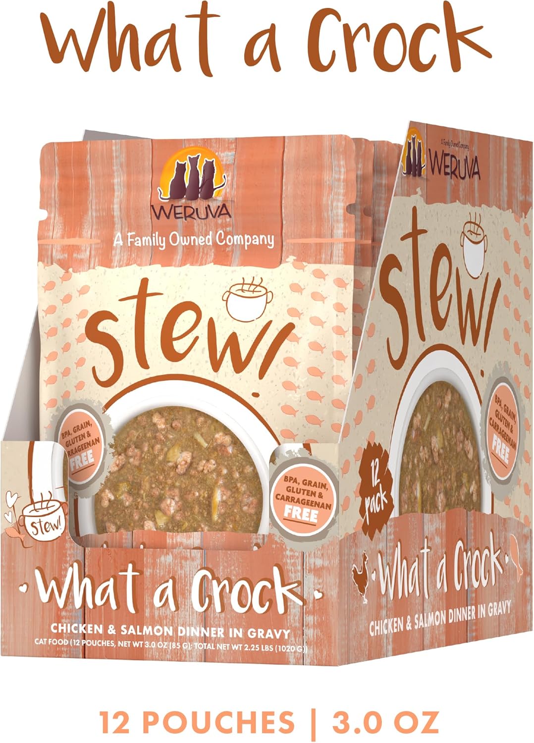 What A Crock (3Oz Pouch, Pack Of 12) Featuring Wild-Caught Salmon, And Cage Free Chicken, Perfectly Minced Together In A Stew Your Cat Will Love!