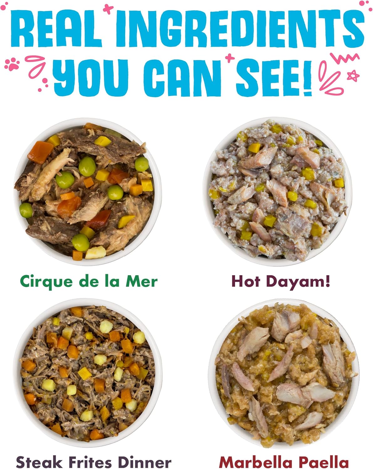 Chicken Free, Just 4 Me!, A Variety Pack With Four (4) Poultry-Free Weruva Recipes 12 Pack Of 14Oz Wet Canned Dog Foods, Including Steak Frites, Hot Dayam, Marbella Paella Cirque De La Mer (3 Of Each 14Oz Can). All Of The Grain-Free Recipes In This Variety Pack Have Limited Ingredients And Do Not Contain Chicken, Duck Or Turkey. Two Recipes Feature Wild-Caught Sustainable Fish And The Other Two Red-Meat Recipes Include Grass-Fed Beef And Grass-Fed Lamb. Awesome Healthy, Awesome Happy - Welcome To Weruva Grade