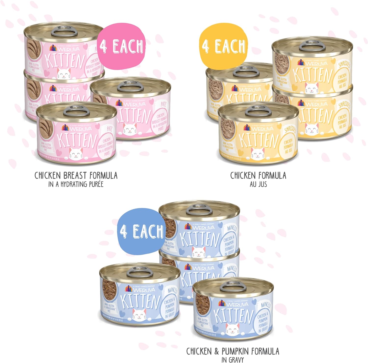 Give Them Weruva From The Start! Each Weruva Kitten Recipe Provides Your Kitten With The High Quality Ingredients You Know And Love, And Is Specifically Formulated To Support A Growing Kitten Both Physically And Mentally. Always Free Of Grain, Gluten, Carrageenan, Or Any Artificial Flavors, You Can Be Confident Your Little Loved One Is Getting The Best Nutrition! Like All Weruva Foods, Our Kitten Formulas Feature High-Quality Proteins (Real Meat!), And A High Moisture Content From Delicious Gravies Or PatĆ©s. Growing Happy, Growing Healthy, ThatāS The Weruva Way From The Start