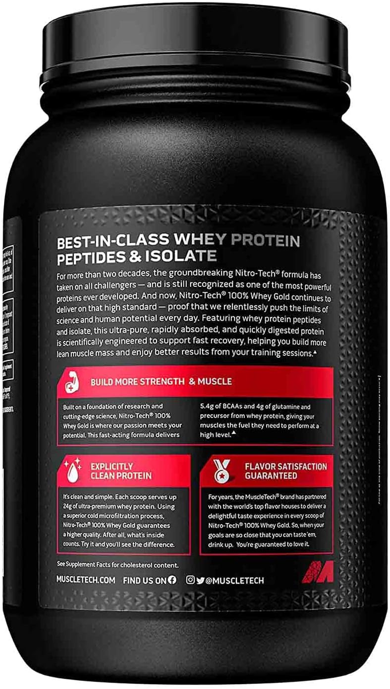 BULLET POINTS  :   1 >  WHEY PROTEIN POWDER β MuscleTech Nitro-Tech Whey Gold features whey protein isolate and peptides, this ultra-pure, rapidly absorbed and quickly digested protein is engineered to support fast recovery, helping you build more lean muscle