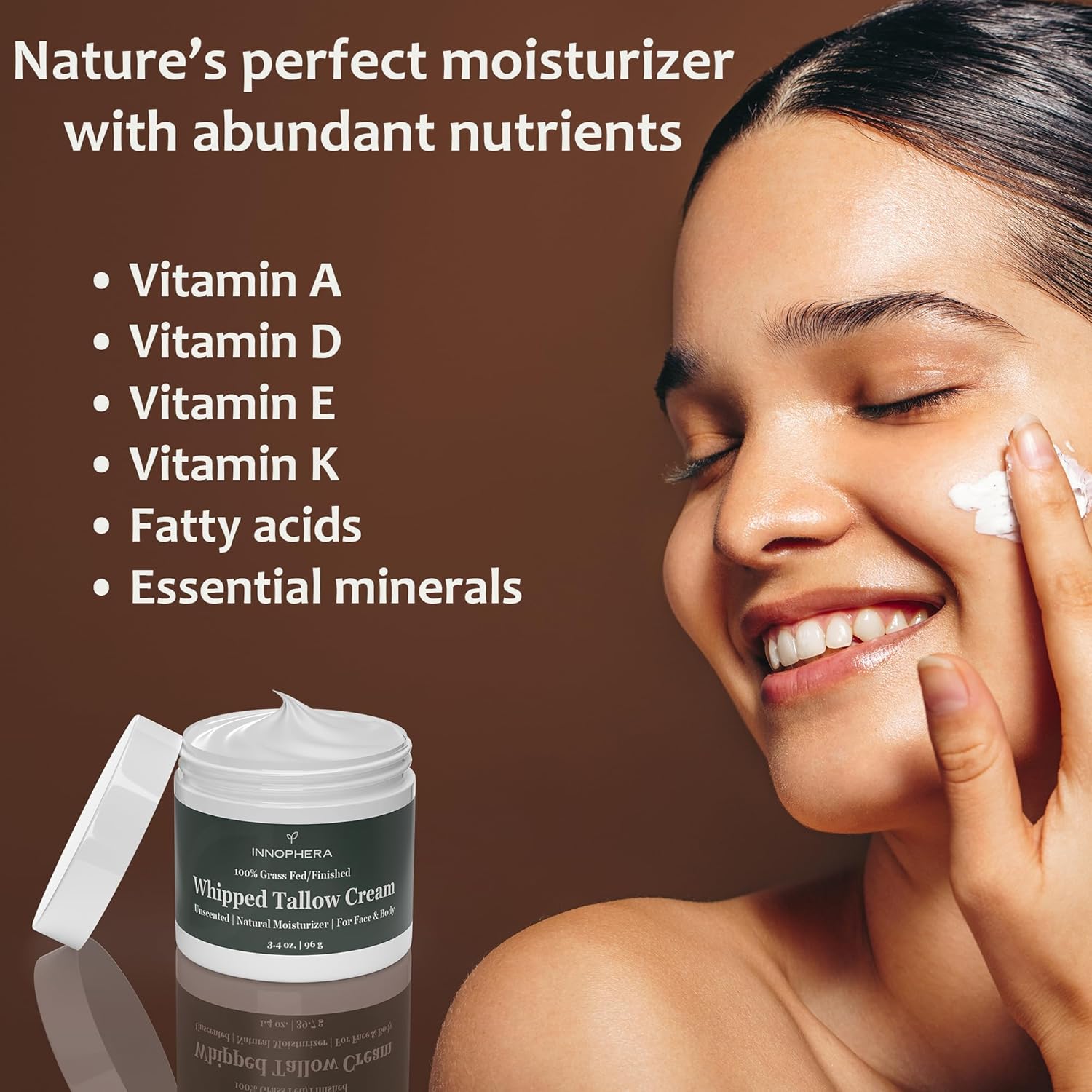 About this item 100% Grass Fed & Finished Beef Tallow - Our whipped tallow cream is handmade with care using grass fed & grass finished beef tallow derived from pasture raised cows on local American farms. All Natural Moisturizer & Lotion - Our whipped tallow cream contains rich nutrients to deeply hydrate and nourish your face and body, including Vitamins A, D, E and K, fatty acids, and essential minerals. Only Two Ingredients - Only rendered beef tallow and organic jojoba oil are used to make our whipped tallow cream, ensuring no harsh chemicals in our product. Tailor Made for Sensitive Skin - Our natural whipped tallow cream is perfect for moisturizing sensitive, dry, or cracked skin, as well as supporting skin elasticity and promoting a radiant glow. Luxurious Texture & Odorless Scent - Enjoy the creamy texture of our odorless whipped tallow cream, ensuring each application leaves your skin feeling incredibly smooth and pampered.  See more product details,100% Grass Fed & Finished Beef Tallow - Our whipped tallow cream is handmade with care using grass fed & grass finished beef tallow derived from pasture raised cows on local American farms,All Natural Moisturizer & Lotion - Our whipped tallow cream contains rich nutrients to deeply hydrate and nourish your face and body, including Vitamins A, D, E and K, fatty acids, and essential minerals,Only Two Ingredients - Only rendered beef tallow and organic jojoba oil are used to make our whipped tallow cream, ensuring no harsh chemicals in our product,Tailor Made for Sensitive Skin - Our natural whipped tallow cream is perfect for moisturizing sensitive, dry, or cracked skin, as well as supporting skin elasticity and promoting a radiant glow,Luxurious Texture & Odorless Scent - Enjoy the creamy texture of our odorless whipped tallow cream, ensuring each application leaves your skin feeling incredibly smooth and pampered