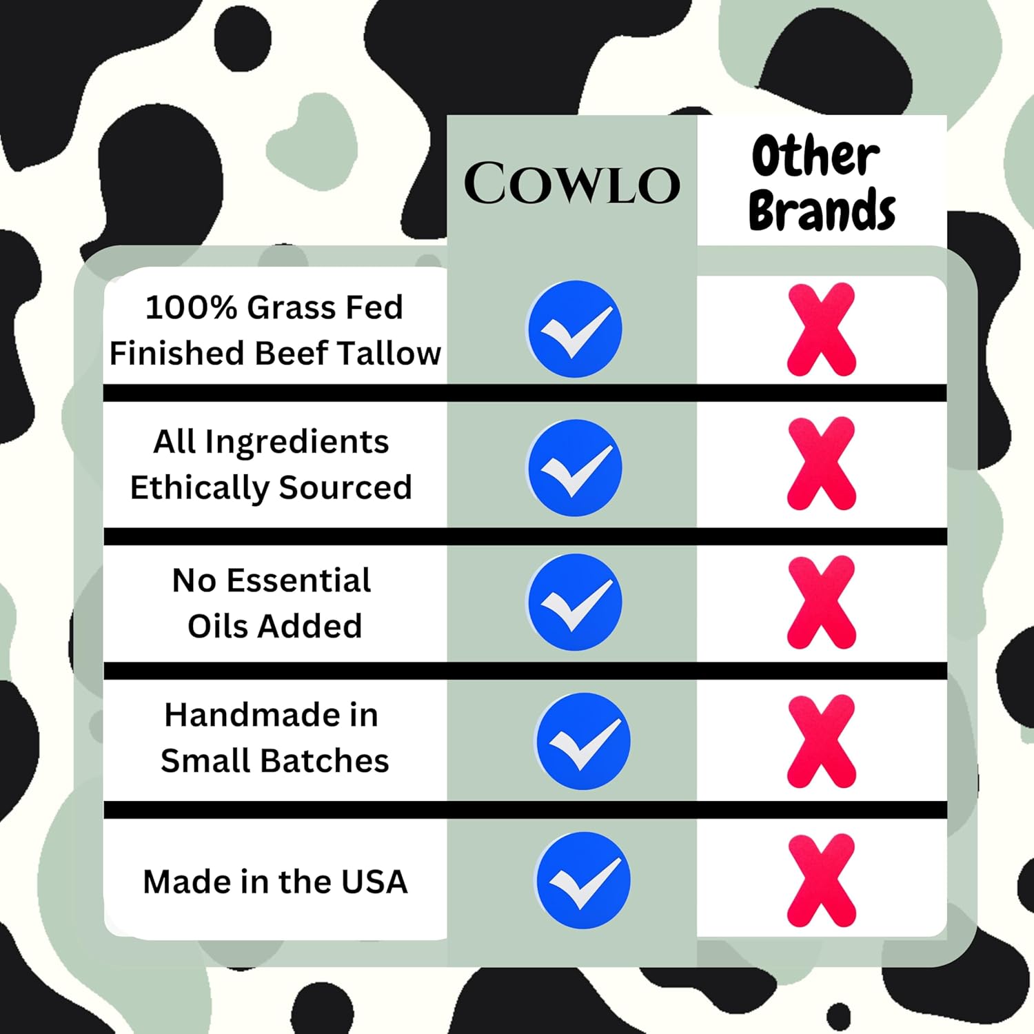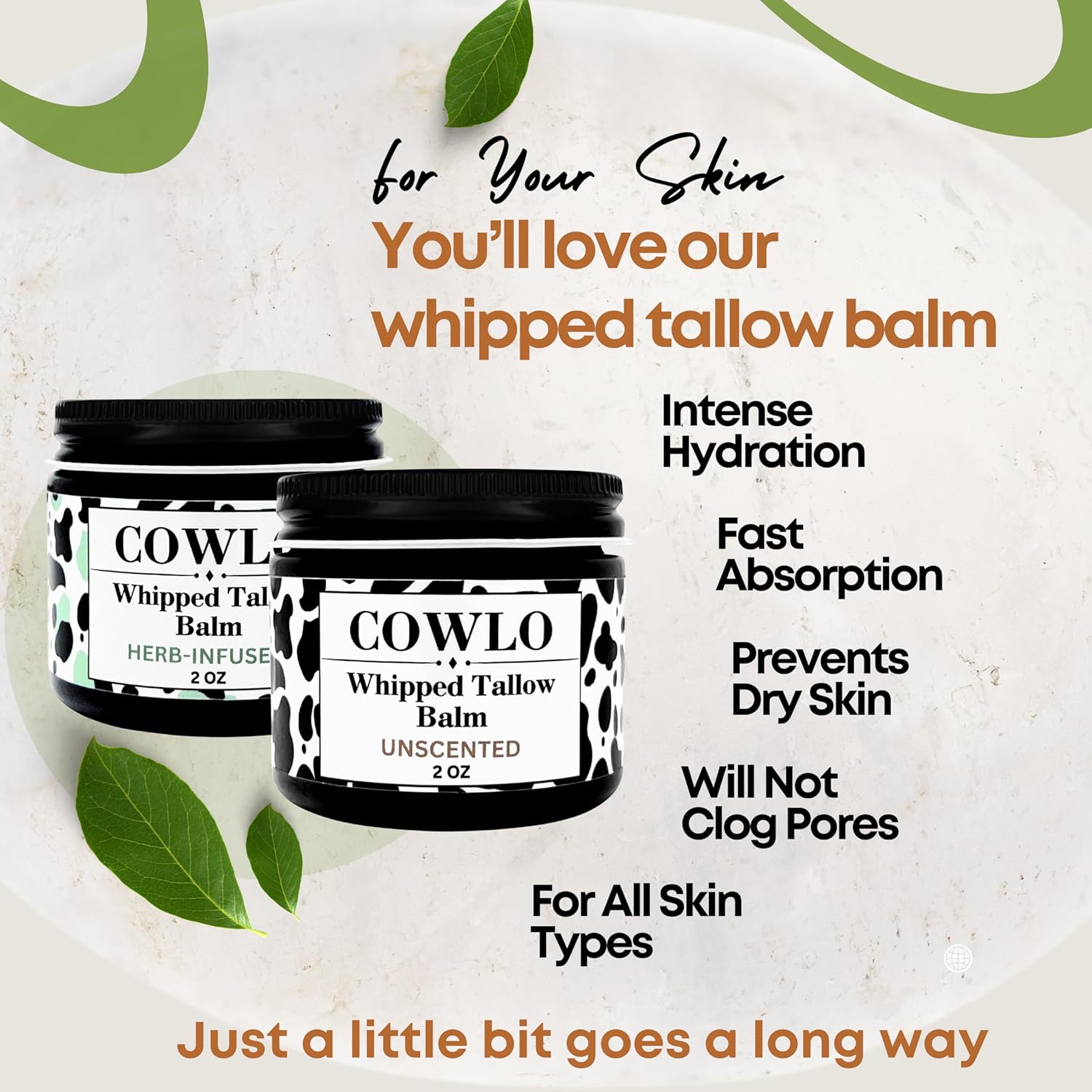 Timeless Skincare Tradition: Beef tallow has been a trusted skincare staple for generations. Before commercial lotions filled with chemicals, our ancestors used animal fats to protect, nourish, and heal their skin. Our light, meltable, whipped tallow balm is a modern take on this time-honored practice, offering deep hydration with simple, natural ingredients. Nature’s Vitamin-Rich Moisturizer: Our grass-fed tallow balm is naturally packed with vitamins A, D, E, K, plus essential fatty acids like stearic and oleic acid, which deeply nourish and protect the skin. The result A balm that is highly moisturizing, nutrient-dense, and naturally shelf-stable—without preservatives or synthetic additives. Ethically Sourced Ingredients: We believe in responsible sourcing. Our 100% grass-fed, grass-finished tallow comes from small American farms practicing regenerative agriculture, where cows graze year-round on open pastures. This high-quality suet fat produces a rich, golden balm with exceptional skin-nourishing properties. Pure, Clean Scent: Many tallow balms have an overpowering beefy smell. Not ours. Our tallow is rendered slowly and naturally, preserving its mild, clean aroma without the beefy smell. When you choose unscented, you’ll enjoy pure, effective skincare—without an off-putting scent. Our Family’s Promise: At Cowlo, we are a small, family-run business dedicated to crafting clean, natural skincare with only the highest-quality organic ingredients. Every batch is handmade in the USA with care, free from synthetic fillers, artificial fragrances, and unnecessary additives. If we wouldn’t use it on our own family, we wouldn’t offer it to yours! See more product details,Timeless Skincare Tradition: Beef tallow has been a trusted skincare staple for generations. Before commercial lotions filled with chemicals, our ancestors used animal fats to protect, nourish, and heal their skin. Our light, meltable, whipped tallow balm is a modern take on this time-honored practice, offering deep hydration with simple, natural ingredients,Nature’s Vitamin-Rich Moisturizer: Our grass-fed tallow balm is naturally packed with vitamins A, D, E, K, plus essential fatty acids like stearic and oleic acid, which deeply nourish and protect the skin. The result A balm that is highly moisturizing, nutrient-dense, and naturally shelf-stable—without preservatives or synthetic additives,Ethically Sourced Ingredients: We believe in responsible sourcing. Our 100% grass-fed, grass-finished tallow comes from small American farms practicing regenerative agriculture, where cows graze year-round on open pastures. This high-quality suet fat produces a rich, golden balm with exceptional skin-nourishing properties,Pure, Clean Scent: Many tallow balms have an overpowering beefy smell. Not ours. Our tallow is rendered slowly and naturally, preserving its mild, clean aroma without the beefy smell. When you choose unscented, you’ll enjoy pure, effective skincare—without an off-putting scent,Our Family’s Promise: At Cowlo, we are a small, family-run business dedicated to crafting clean, natural skincare with only the highest-quality organic ingredients. Every batch is handmade in the USA with care, free from synthetic fillers, artificial fragrances, and unnecessary additives. If we wouldn’t use it on our own family, we wouldn’t offer it to yours!