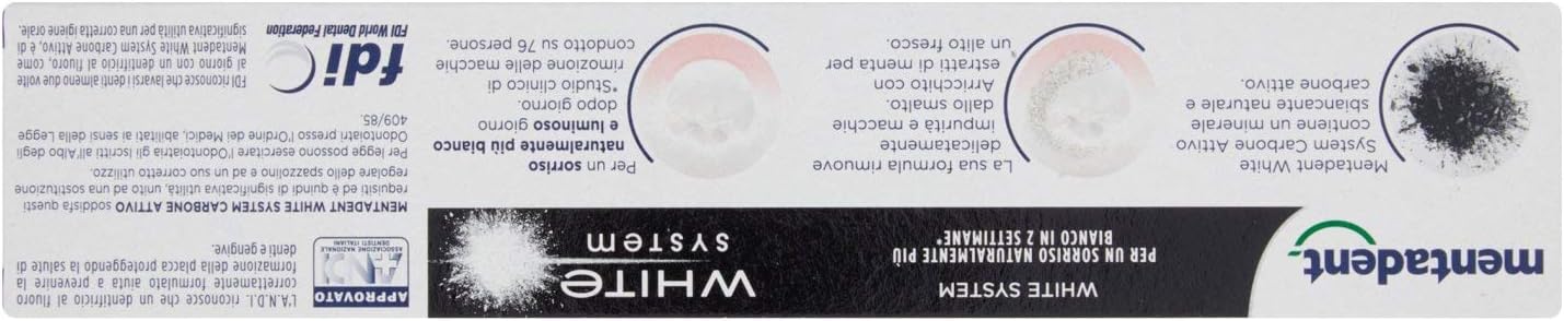 About this item Formula gently removes impurities and stains from nail polish Enriched with mint extracts for fresh breath High quality product Mentadent White System Activated Carbon contains a natural whitening mineral and activated International products have separate terms, are sold from abroad and may differ from local products, including fit, age ratings, and language of product, labeling or instructions. › See more product details,Formula gently removes impurities and stains from nail polish,Enriched with mint extracts for fresh breath,High quality product,Mentadent White System Activated Carbon contains a natural whitening mineral and activated,International products have separate terms, are sold from abroad and may differ from local products, including fit, age ratings, and language of product, labeling or instructions