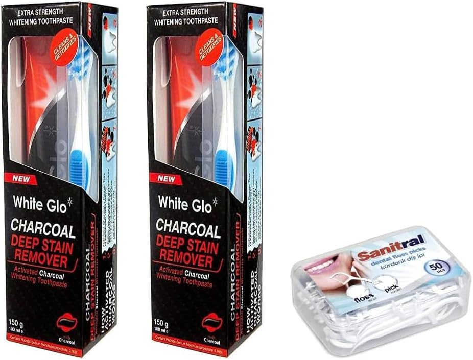 Product description Experience the power of White Glo's Charcoal Deep Stain Remover Toothpaste, now available in a convenient pack of two 100ml tubes. This adult-focused formula harnesses the natural whitening properties of charcoal and fluoride for effective cavity protection. Its low-abrasion design ensures daily use without damaging enamel, making it suitable for regular oral care. Each pack includes a bonus 50-pack of Sanitral Dental Floss Sticks for comprehensive oral hygiene. Simply apply a pea-sized amount, brush in circular motions for two minutes, focusing on stained areas, and rinse. Follow up with the dental floss for optimal results. Keep out of reach of children and store in a cool, dry place. Directions Squeeze a pea-sized amount onto toothbrush, brush teeth in circular motions for 2 minutes, rinse with water. P.when('A').execute(function(A) { A.on('a:expander:toggle_description:toggle:collapse', function(data) { window.scroll(0, data.expander.$expander[0].offsetTop-100); }); }); Safety Warning Keep out of reach of children. For adult use only. Do not swallow. If swallowed, seek medical advice immediately. Avoid contact with eyes. If contact occurs, rinse immediately with water and seek medical advice if irritation persists. Store in a cool, dry place. See more,White Glo Charcoal Deep Stain Remover Toothpaste, 100ml -Pack of 2,Fluoride protection against cavities,Low abrasion (safe for daily use),Effective whitening formula,with Sanitral 50 Pcs Dental Floss Stick Included as a Gift