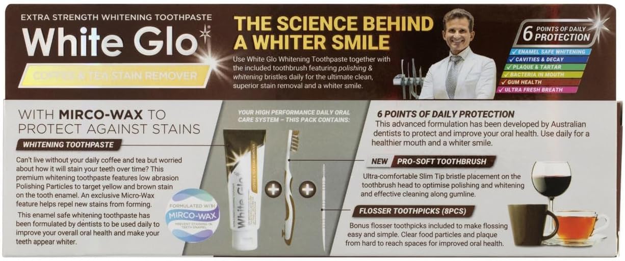 Product Description White Glo Coffee & Tea Drinkers Formula Whitening Toothpaste is a revolutionary toothpaste with Micro Polishing Particles to target discolouration and yellowing on the tooth enamel caused by consumption of coffee and tea over time. White Glo's exclusive Micro-Wax Protective Shield Formula also helps to repel new stains from forming, leaving teeth whiter, shinier and glossier. Fluoride protection against cavities. Free whitening toothbrush and dental flosser with each pack. Low Abrasion - Safe for daily use. Effective whitening formula from White Glo - Australia's rated number one most effective whitening toothpaste. Free whitening toothbrush and dental flosser with each pack. Ingredients Calcium Carbonate, Aqua (Water), Glycerin, Sorbitol, Silica, Aroma (Flavour), Sodium Lauryl Sulphate, Copernicia Cerifera (Carnauba) Wax, Carboxymethyl Hydroxyethylcellulose, Chondrus Crispus (Carrageenan), Sodium Saccharin, Rosa Canina Fruit Oil, Sodium Monofluorophosphate, CI 77891 (Titanium Dioxide). P.when('A').execute(function(A) { A.on('a:expander:toggle_description:toggle:collapse', function(data) { window.scroll(0, data.expander.$expander[0].offsetTop-100); }); }); Directions Use daily to replace your ordinary toothpaste. Brush thoroughly with the bonus toothbrush twice a day or as directed by your dentist. Electric toothbrush users can also use this toothpaste. Safety Warning Children of 6 years and younger: use a pea sized amount for supervised brushing to minimise swallowing. In case of intake of fluoride from other sources consult a dentist or doctore. Before use of this toothpaste please seek medical advise for pregnant women and children under the age of twelve. Box Contains 1 x White Glo 150g Coffee & Tea Drinkers Formula Toothpaste 1 x Bonus White Glo Anti-Stain Toothbrush 1 x Bonus pack of White Glo Dental Flosser Toothpicks See more,NO MORE COFFEE, TEA AND WINE STAINS, PREMIUM WHITENING ORAL CARE: White Glo Coffee and Tea Extra Strength Whitening Toothpaste is a revolutionary toothpaste with Micro-Polishing Particles targets discolouration and yellowing on tooth enamel caused by consumption of coffee and tea over time. It also contains Premium Fluoride that protects against tooth decay, remineralises weakened tooth enal and prevents the growth of harmful oral bacteria,LONG LASTING RESULTS: Proprietary Micro Wax Formula repels new stains from forming while leaving teeth whiter, shinier and glossier than ever before,SMILE WITH CONFIDENCE: Originally developed for models, actors and actresses to give them the brightest and whitest smile possible. When you smile, we smile,COMPLEMENTARY TOOTHBRUSH AND FLOSSER TOOTHPICKS: Our special Anti-Stain Toothbrush has been specially developed to work in conjunction with our toothpaste and increase effectiveness. The extra condensed bristles on Anti-Stain Toothbrush compliment the micro-particles to give you the brighest, freshest smile possible. Changing your toothbrush regularly also ensures greater oral hygeine,MILLIONS OF AUSSIE SMILES POWERED BY WHITE GLO SINCE 1993: We'd be honoured if you can join us. Welcome to the White Glo Family
