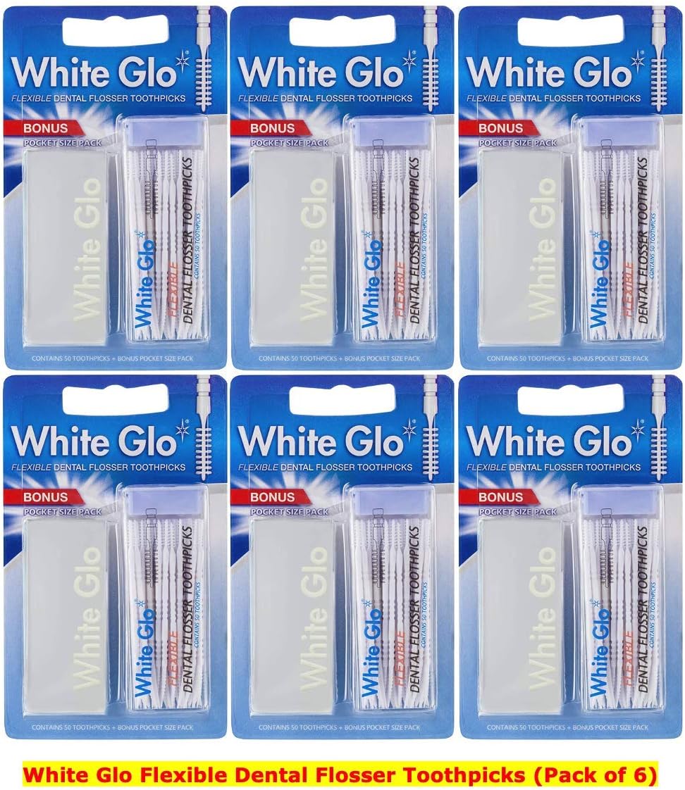 Each pack contains 50 toothpicks PLUS bonus convenient pocket size pack White Glo Flexible Dental Flosser Toothpicks (Pack of 6)