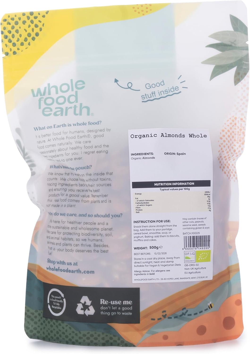 About this item ? A WORLD OF GOODNESS: In a world of fad diets, quick bites, and intricate recipes, don’t forget about simple, nourishing organic wholefoods. Wholefood Earth is certified organic and has officially been awarded a 5-star Food Hygiene Rating ? NUTRITIOUS ALMONDS WHOLE: Almonds are one of the most popular and widely used nuts in the world, known for their sweetness & especially distinct "Marzipan" flavour. There is a shorter list of foods that aren't complimented by them! ? HIGH-QUALITY INGREDIENTS: Fibrous & nutritious almonds have a creamy texture, highly versatile and taste great raw, roasted, soaked, ground, blended or baked into your favourite foods. Intaking almonds is highly recommended to increase brain nutrients! ? INSTRUCTION FOR USE: Almonds are high in fibre and a source of protein. They have a creamy texture, are highly versatile and taste great raw, roasted, soaked, ground, blended or baked into your favourite foods. ? JUST THE GOOD STUFF / FULLY RECYCLABLE PACKAGING: We intend to get the purest gifts of Mother Nature from all over the world and offer to our customers the purest, organic, and healthy gifts of nature. Our products are gathered from the best origins ? OUR STORY: We believe that Mother Nature knows best when it comes to quality, nutrition, and taste. We actively seek sustainable sources for our goods, asking our suppliers the tough questions that we know matter to our customers › See more product details,? A WORLD OF GOODNESS: In a world of fad diets, quick bites, and intricate recipes, don’t forget about simple, nourishing organic wholefoods. Wholefood Earth is certified organic and has officially been awarded a 5-star Food Hygiene Rating,? NUTRITIOUS ALMONDS WHOLE: Almonds are one of the most popular and widely used nuts in the world, known for their sweetness & especially distinct "Marzipan" flavour. There is a shorter list of foods that aren't complimented by them!,? HIGH-QUALITY INGREDIENTS: Fibrous & nutritious almonds have a creamy texture, highly versatile and taste great raw, roasted, soaked, ground, blended or baked into your favourite foods. Intaking almonds is highly recommended to increase brain nutrients!,? INSTRUCTION FOR USE: Almonds are high in fibre and a source of protein. They have a creamy texture, are highly versatile and taste great raw, roasted, soaked, ground, blended or baked into your favourite foods,? JUST THE GOOD STUFF / FULLY RECYCLABLE PACKAGING: We intend to get the purest gifts of Mother Nature from all over the world and offer to our customers the purest, organic, and healthy gifts of nature. Our products are gathered from the best origins,? OUR STORY: We believe that Mother Nature knows best when it comes to quality, nutrition, and taste. We actively seek sustainable sources for our goods, asking our suppliers the tough questions that we know matter to our customers