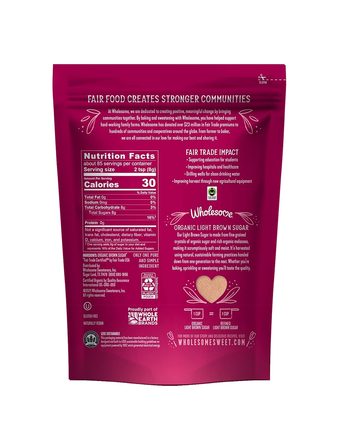 Wholesome Fair Trade Organic Light Brown Sugar is soft, moist and fine-grained. It is perfect for all your baking needs and especially good in cakes, cookies, pies, and muffins. Organic Light Brown Sugar also makes a wonderful topping for warm oatmeal. Use as a one-for-one replacement for refined light brown sugar in any recipe. Wholesome has a strong commitment to sustainable agriculture. In adherence with strict organic standards, the sugar cane fields are green cut and are not burned or treated with chemical herbicides or synthetic fertilizers. This is better for the environment, which ultimately, we believe is better for everyone. This also creates the highest quality, most delicious-tasting unrefined brown sugar you can find. No chemicals, bone char, or animal by-products are used to make or de-colorize this sugar making it ideal for vegans. Fair Trade Certification is Wholesomeās guarantee that our farming cooperatives are paid directly for the cane grown and milled. This means that the farmers can compete with factory farms, cultivate high quality cane crops, send their kids to school and build thriving communities. Thank you for choosing Wholesome!