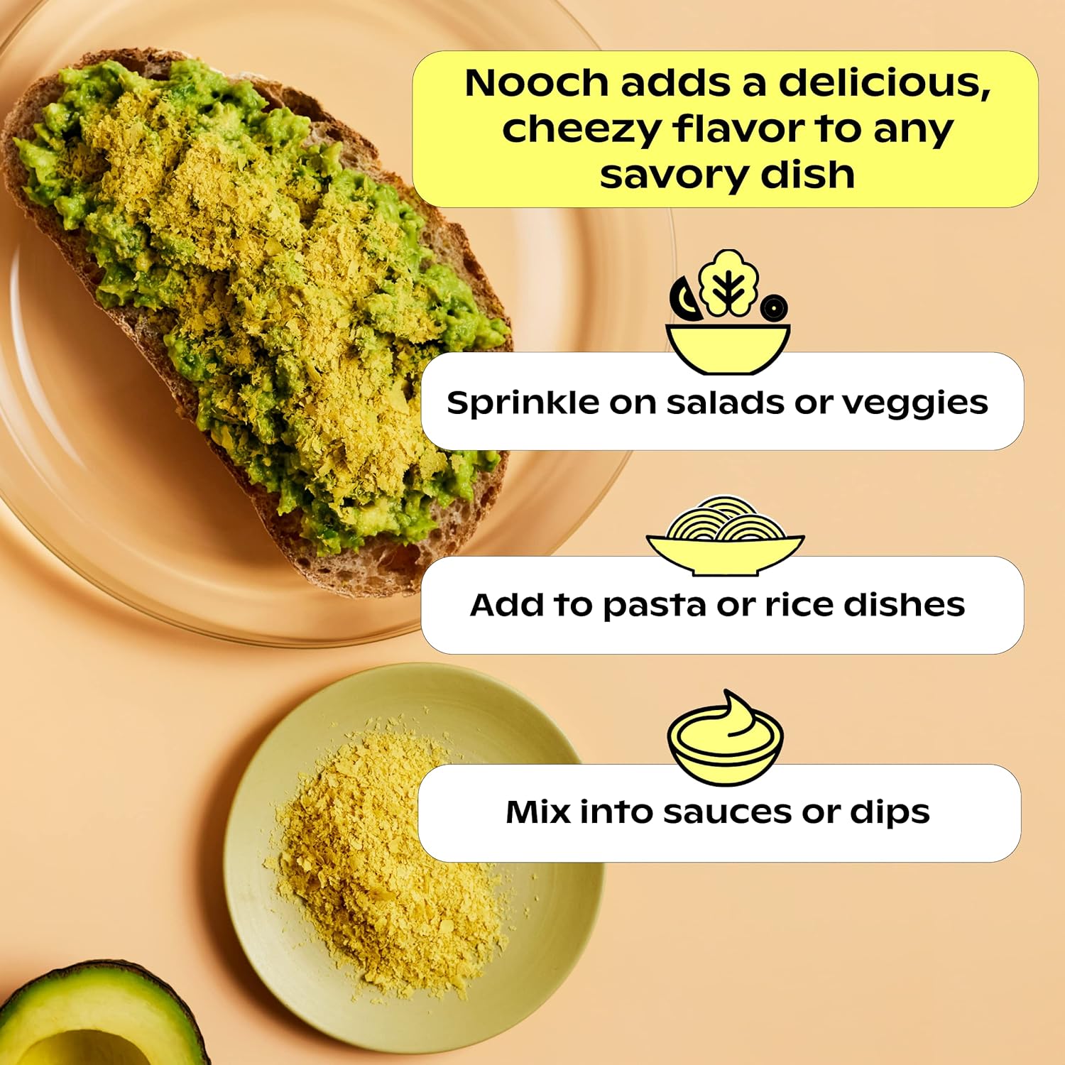 DAIRY-FREE, CHEEZY FUNCTIONAL SEASONING – The delicious cheesy flavor of nutritional yeast combined with powerful nutrients to support your overall health. You can use Nooch as a seasoning on any savory dish including salads, vegetables, dips, pastas and more. The flakes are vegan, gluten-free, candida-free and non-GMOPREBIOTICS + PROBIOTICS – The only nutritional yeast flakes to combine prebiotics and vegan probiotics to support your digestion, gut health and fight bloating. The delicious vegan cheese substitute combines organic prebiotic mushrooms and 1 Billion CFU of three powerful strains of probiotics (Lactobacillus rhamnosus, Lactobacillus helveticus, Saccharomyces boulardii)VEGAN VITAMIN D3, METHYLCOBALAMIN B12 + MORE – The only nutritional yeast to include the active form of vitamin D (vitamin D3) in vegan form. Our nutritional yeast flakes also use the active form of vitamin B12 (methylcobalamin). It’s also packed with naturally occurring B vitamins from the fermentation processSUPPORTS DIGESTION + ENERGY – The powerful combination of prebiotics and probiotics support your gut health, digestion and may offer bloating relief. The B vitamins help support energy levels, metabolism and skin healthDELICIOUS FLAVORS – Nooch comes in two delicious flavors including Natural, the traditional cheezy flavor, and Sweet Cayenne, a tangy and smoky BBQ blend