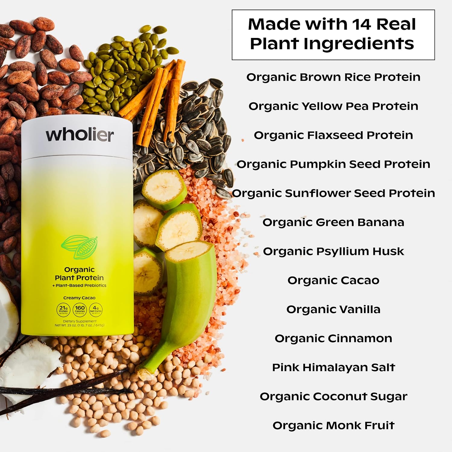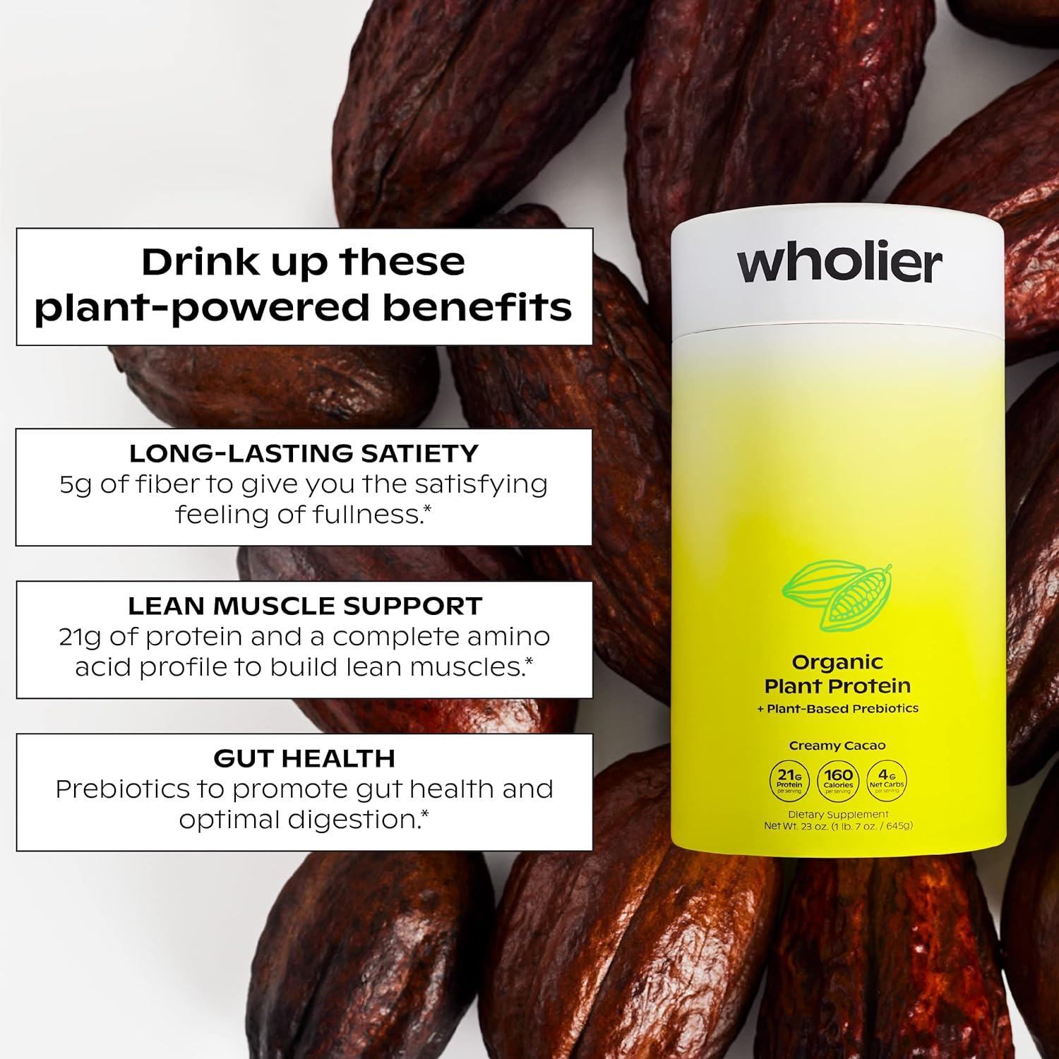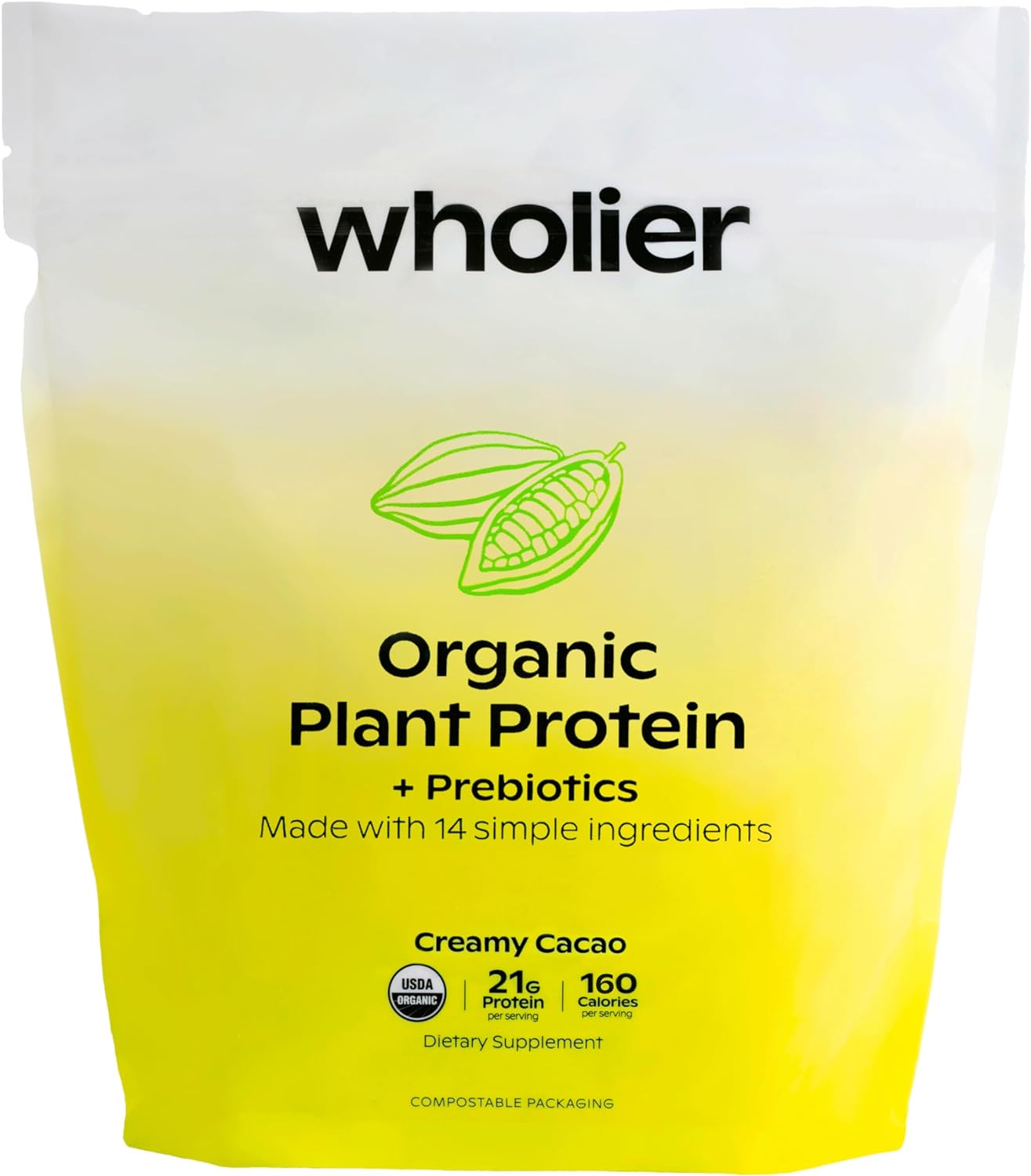 Wholier Organic Plant Protein + Prebiotics. 21G Of Vegan Protein. 5G Of Fiber. Psyllium Husk + Green Banana For Digestion. No Natural Flavors, Gums Or Fillers. Creamy Cacao