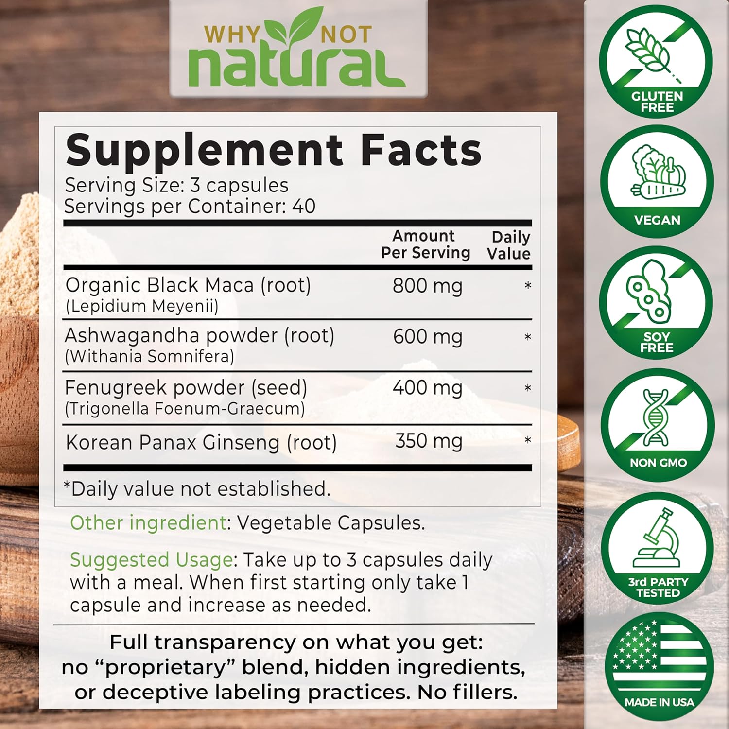 Why Not Natural 4-In-1 Organic Black Maca Root, Ashwagandha, Fenugreek, Panax Ginseng Capsules, Supplement For Men And Women (120 Count (Pack Of 1)