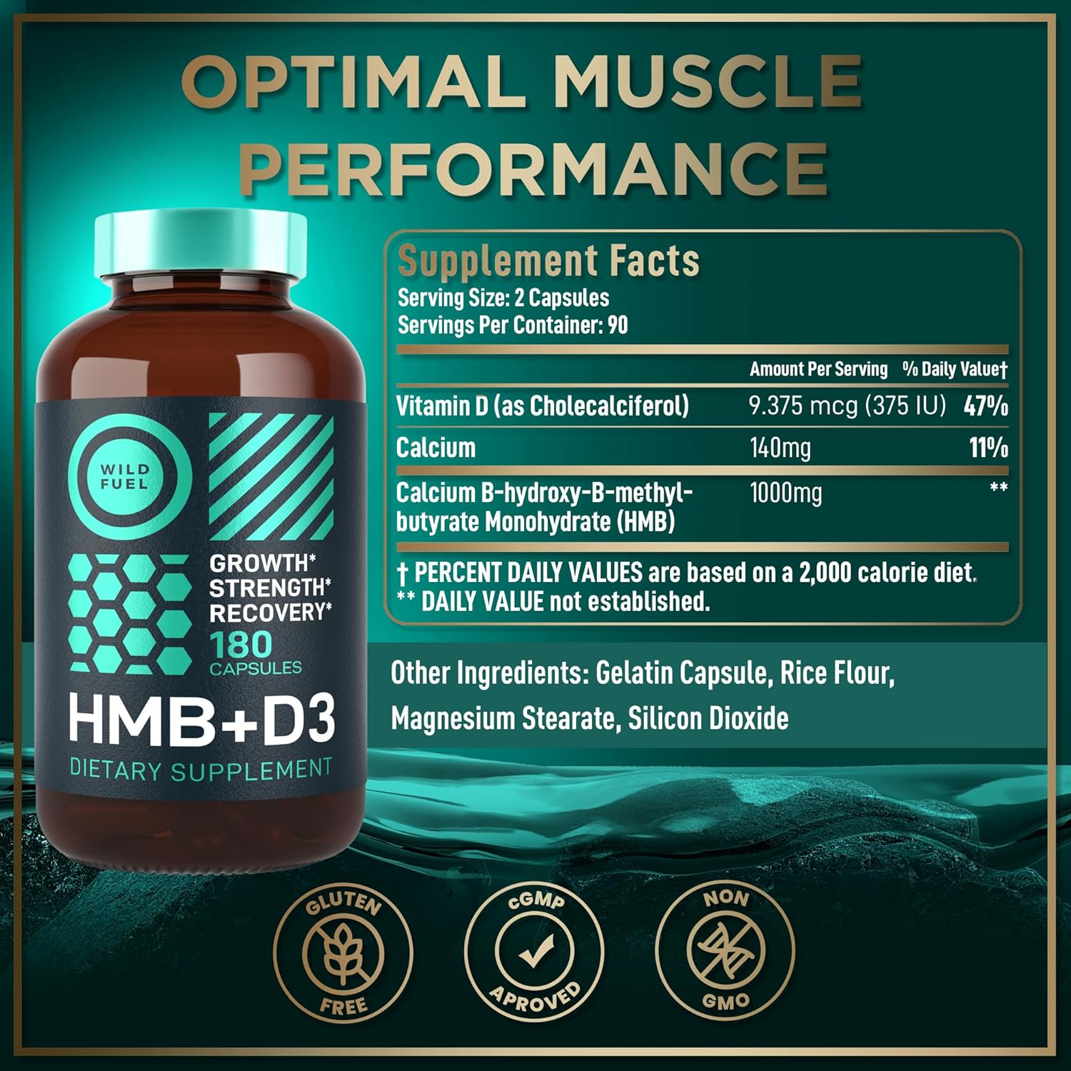 Wild Fuel Hmb 1,000Mg Per Serving, 90 Servings - Vitamin D3, Calcium Beta-Hydroxy Beta-Methylbutyrate Hmb Supplements For Men & Women - Muscle Growth, Strength, Fast Workout Recovery - 180 Capsules