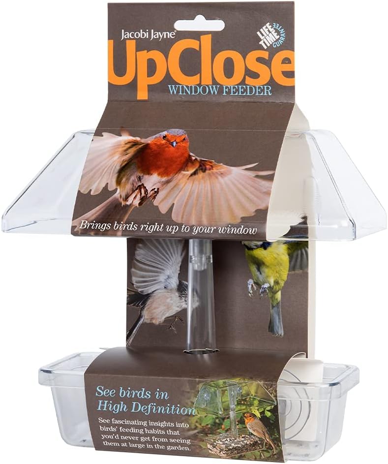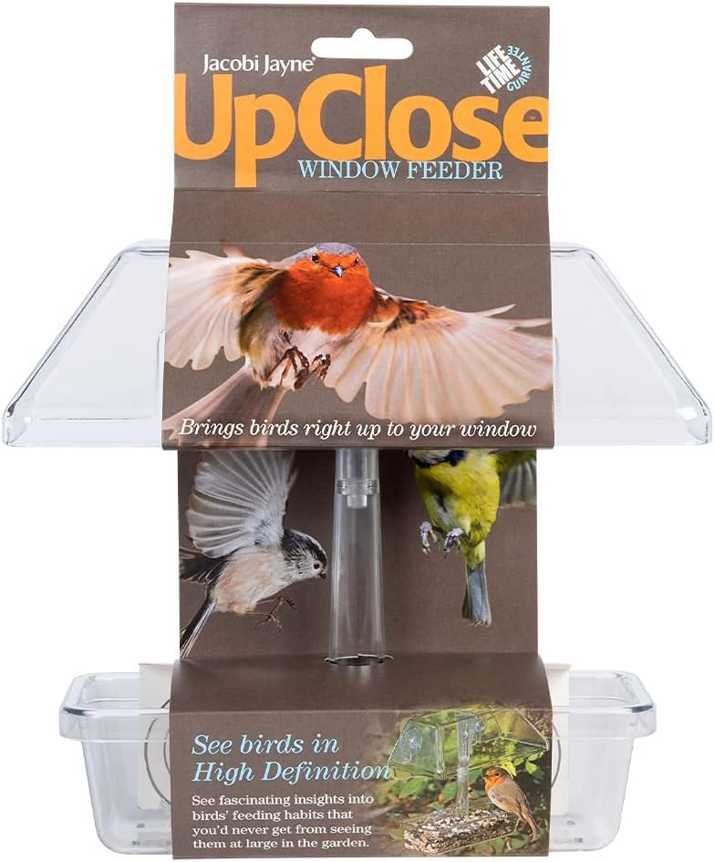 Jacobi Jayne® UpClose™ Window Bird Feeder - bring birds right up to your window. See fascinating insights into birds' feeding habits that you'd never get from seeing them usually in the garden. Featuring drainage holes to prevent waterlogged food and a rain canopy to shelter feeding birds from the rain. The UpClose Window Feeder comes with Lifetime Care should any parts become defective or broken - contact the Jacobi Jayne Parts website for more information