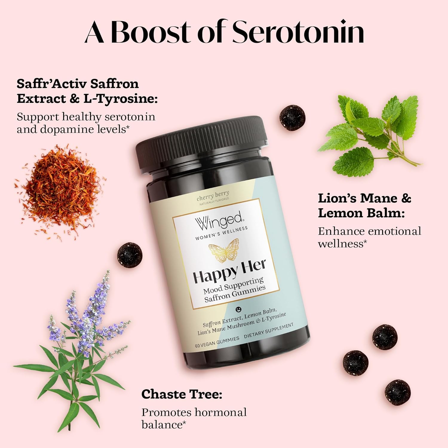 About this item Mood-Boosting Gummies for Women: Add some sparkle to your day with Winged Wellness Happy Her Gummies. Our formula helps women boost emotional wellness with ingredients that support balance and a positive mindset. 50 gummies. Servings: 25 A Serotonin Boost: Happy Her gummies feature key ingredients that boost brain health, uplift your mood, and encourage healthy hormone levels. 30mg of Saffr’Activ: Using well-researched ingredients like Saffr’Activ Saffron Extract, L-Tyrosine, Lion’s Mane, Lemon Balm, and Chaste Tree, Happy Her gummies work with your body for overall happiness. Always for Women, Always Without Additives: Happy Her Gummies are vegan, gluten free, non-GMO, and third-party tested for quality. If you don’t love them in 30 days, we’re happy to help! How to Take: Take 2 gummies daily. Use for 30 days for full benefits. Our supplements are made to be used together for customizable wellness. Happy, Healthy Her: Winged helps women feel their best with unique formulas that promote hormonal balance and relaxation. See more product details,Mood-Boosting Gummies for Women: Add some sparkle to your day with Winged Wellness Happy Her Gummies. Our formula helps women boost emotional wellness with ingredients that support balance and a positive mindset. 50 gummies. Servings: 25,A Serotonin Boost: Happy Her gummies feature key ingredients that boost brain health, uplift your mood, and encourage healthy hormone levels,30mg of Saffr’Activ: Using well-researched ingredients like Saffr’Activ Saffron Extract, L-Tyrosine, Lion’s Mane, Lemon Balm, and Chaste Tree, Happy Her gummies work with your body for overall happiness,Always for Women, Always Without Additives: Happy Her Gummies are vegan, gluten free, non-GMO, and third-party tested for quality. If you don’t love them in 30 days, we’re happy to help!,How to Take: Take 2 gummies daily. Use for 30 days for full benefits. Our supplements are made to be used together for customizable wellness,Happy, Healthy Her: Winged helps women feel their best with unique formulas that promote hormonal balance and relaxation