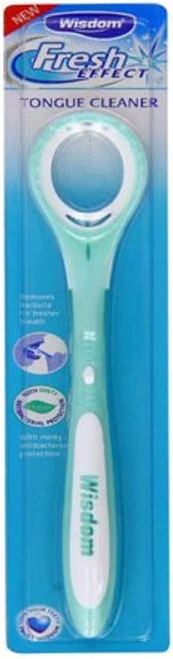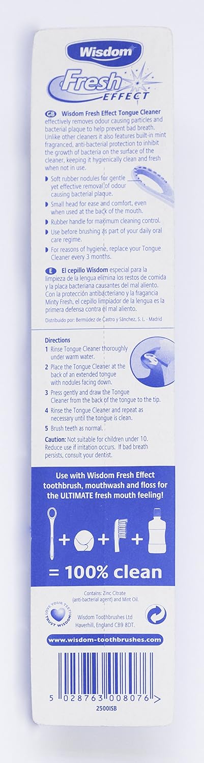 Product Description Wisdom fresh effect tongue cleaner effectively removes odour causing particles and bacterial plaque to help prevent bad breath. Unlike other cleaners it also features built in mint fragranced, anti bacterial protection to inhibit the growth of bacteria on the surface of the cleaner, keeping it hygienically clean and fresh when not in use. Directions Rinse tongue cleaner thoroughly under warm water. Place the tongue cleaner at the back of an extended tongue with nodules facing down. Pres gently and draw the tongue cleaner from back of the tongue to tip. Rinse tongue cleaner and repeat as necessary until tongue is clean. Brush teeth as normal. P.when('A').execute(function(A) { A.on('a:expander:toggle_description:toggle:collapse', function(data) { window.scroll(0, data.expander.$expander[0].offsetTop-100); }); }); Safety Warning Not suitable for children under 10 years. Box Contains 1 x Wisdom Fresh Effect Tongue Cleaner See more,Soft rubber nodules for gentle yet effective removal of odour causing bacteria for fresher breath,Small head for ease and comfort, even when used at the back of the mouth,Rubber handle for maximum cleaning control,Contains minty antibacterial protection,Effectively removes odour causing particles and bacterial plaque