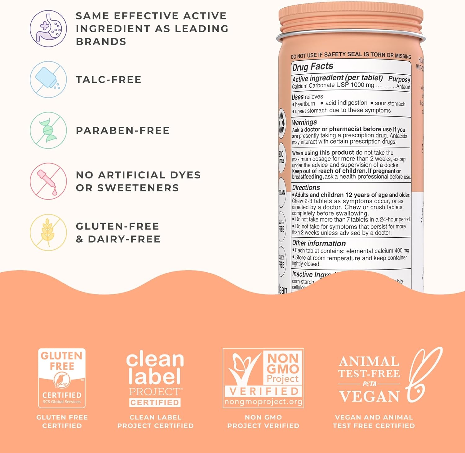 About this item SAME EFFECTIVENESS AS LEADING BRANDS – 1000mg Calcium Carbonate medicine relieves heartburn, acid reflux symptoms like indigestion, sour belly and upset stomach quickly with the same active ingredient dosage as leading brands MAXIMUM STRENGTH & INSTANT RELIEF – 3 fast acting chews per packet offer soothing relief with a great taste, no unnecessary ingredients and sustainable packaging CLEAN INGREDIENTS - We use active pharmaceutical ingredients to formulate effective medicine that is NON-GMO, vegan, and free of artificial dyes, including Red Dye 3, artificial sweeteners, talc, titanium dioxide, parabens, gluten, and dairy DELICIOUS FLAVOR – The Tropical Fruit flavor tastes like a bright, refreshing medley of mango, pineapple, and oranges. With flavor so crisp, you’ll feel like you’re on a beach in the Caribbean HOW TO USE – Chew 2-3 tablets for Women, Men, Adults and Children 12 years or older as symptoms occur. If pregnant or breastfeeding ask a health professional before use See more product details,SAME EFFECTIVENESS AS LEADING BRANDS – 1000mg Calcium Carbonate medicine relieves heartburn, acid reflux symptoms like indigestion, sour belly and upset stomach quickly with the same active ingredient dosage as leading brands,MAXIMUM STRENGTH & INSTANT RELIEF – 3 fast acting chews per packet offer soothing relief with a great taste, no unnecessary ingredients and sustainable packaging,CLEAN INGREDIENTS - We use active pharmaceutical ingredients to formulate effective medicine that is NON-GMO, vegan, and free of artificial dyes, including Red Dye 3, artificial sweeteners, talc, titanium dioxide, parabens, gluten, and dairy,DELICIOUS FLAVOR – The Tropical Fruit flavor tastes like a bright, refreshing medley of mango, pineapple, and oranges. With flavor so crisp, you’ll feel like you’re on a beach in the Caribbean,HOW TO USE – Chew 2-3 tablets for Women, Men, Adults and Children 12 years or older as symptoms occur. If pregnant or breastfeeding ask a health professional before use