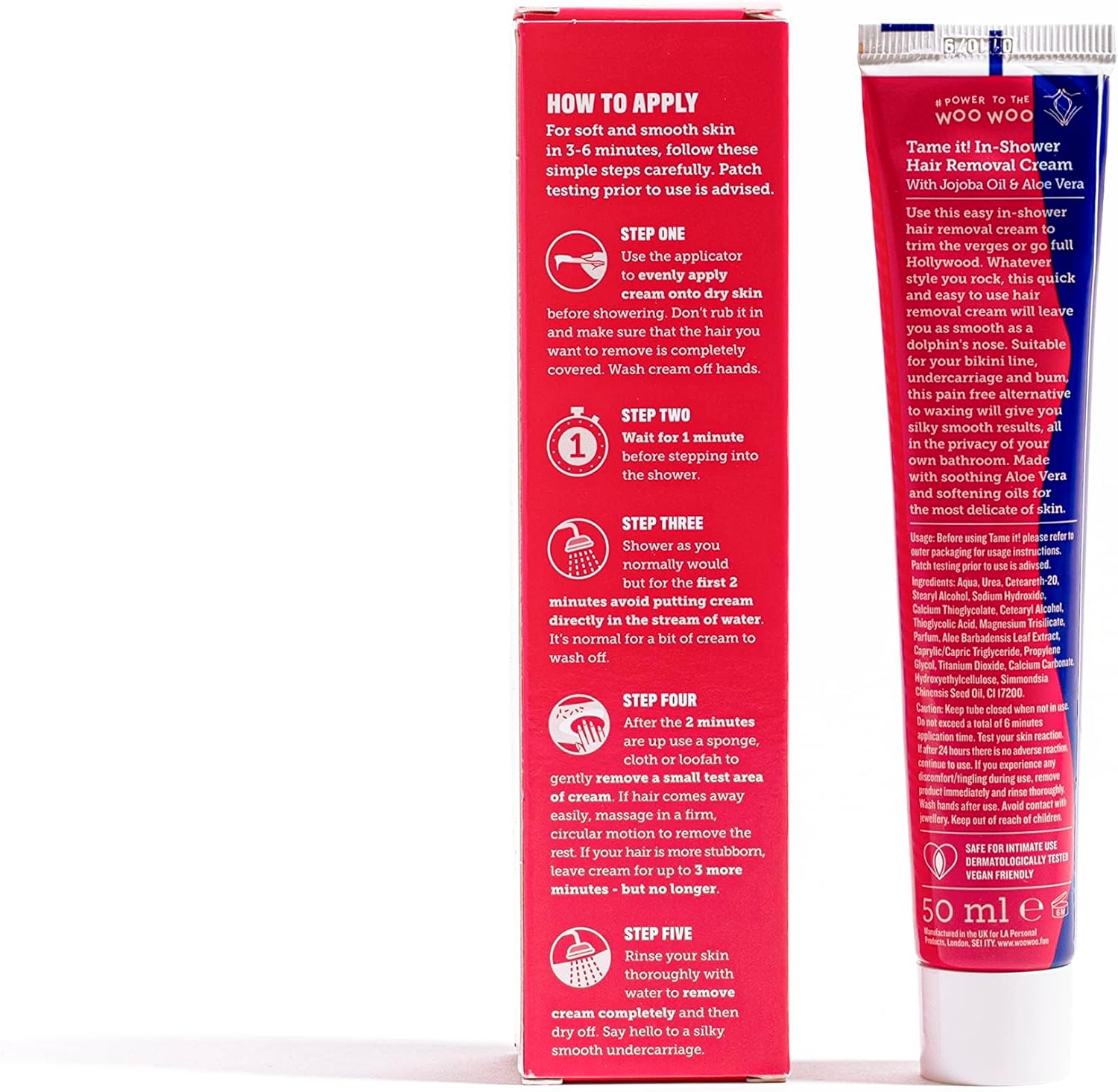 Woowoo Tame It! Natural Intimate Hair Removal Cream - Painless Vegan Hair Remover For Sensitive Skin - Depilatory For Genitals, Bikini, Legs & Bum - Women In-Shower Cream With Aloe Vera - 50Ml