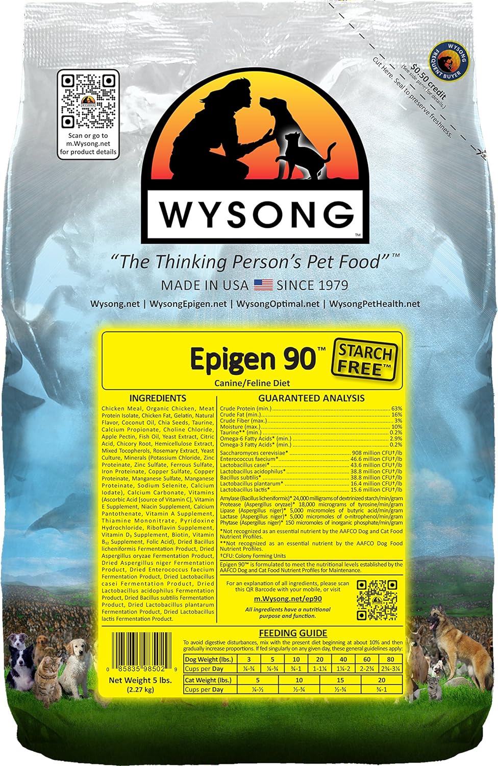 The first extruded dry diet/kibble pet food that is Starch Free (Epigen does what "Grain Free" dog food and cat foods only pretend to do)10More closely resembles the food your pet is designed to eat. Has the natural flavor and taste that pets truly desire10Is replete with all the critical food elements Wysong was first to put into pet foods – probiotics, prebiotics, enzymes, phytonutrients, nutraceuticals, natural form antioxidants, vitamins and minerals10Contains unprecedented and unequalled meat content, including organic. Rich in omega-3's and other essential fatty acids10Very nutrient dense. Introduce slowly according to the feeding guidelines. Can be used as a protein booster and meal supplement