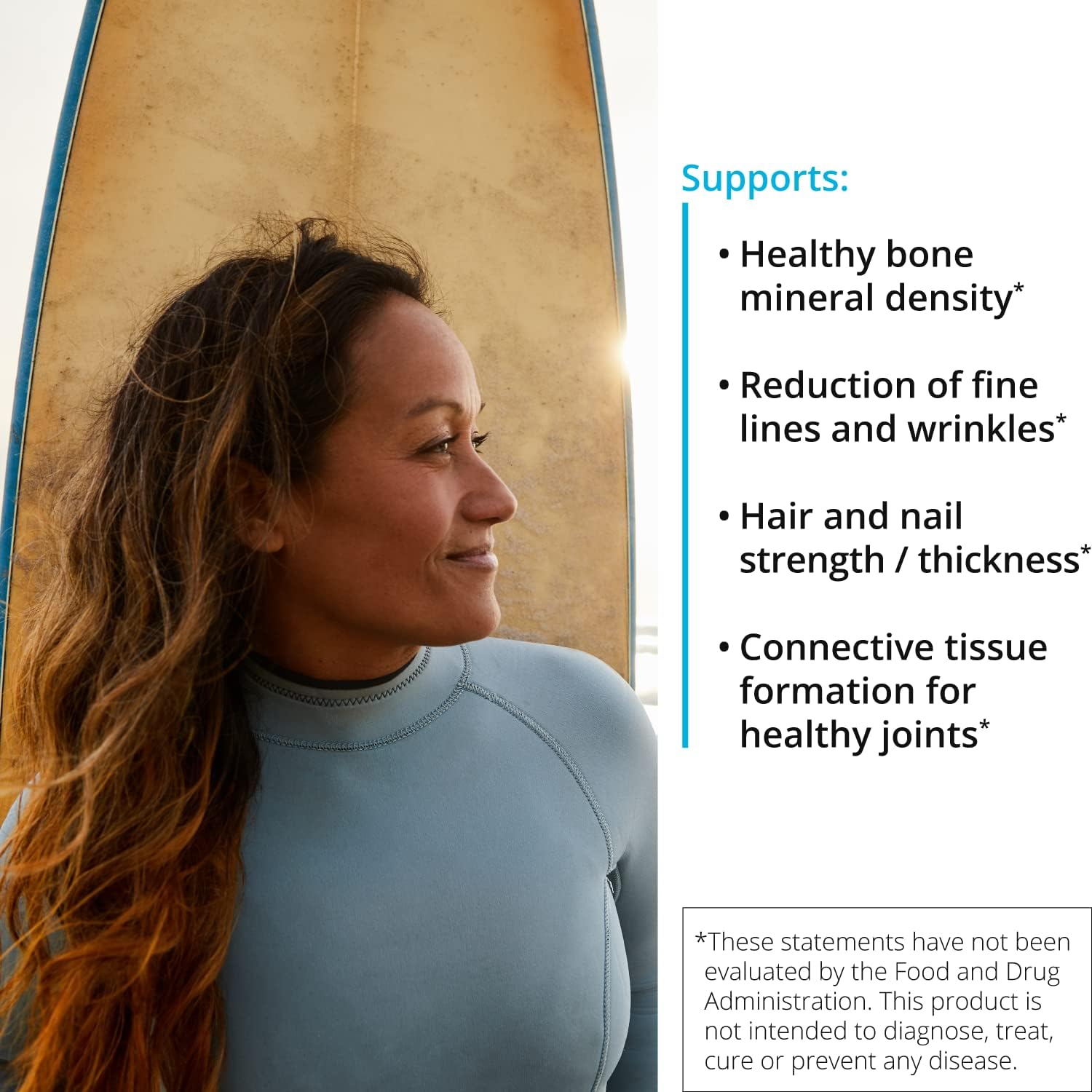 With ingredients to help reduce fine lines and wrinkles, thicken and strengthen hair. Supports connective tissue formation to support joint health. Supports healthy bone mineral density and bone health. Supports generation of collagen for women and men
