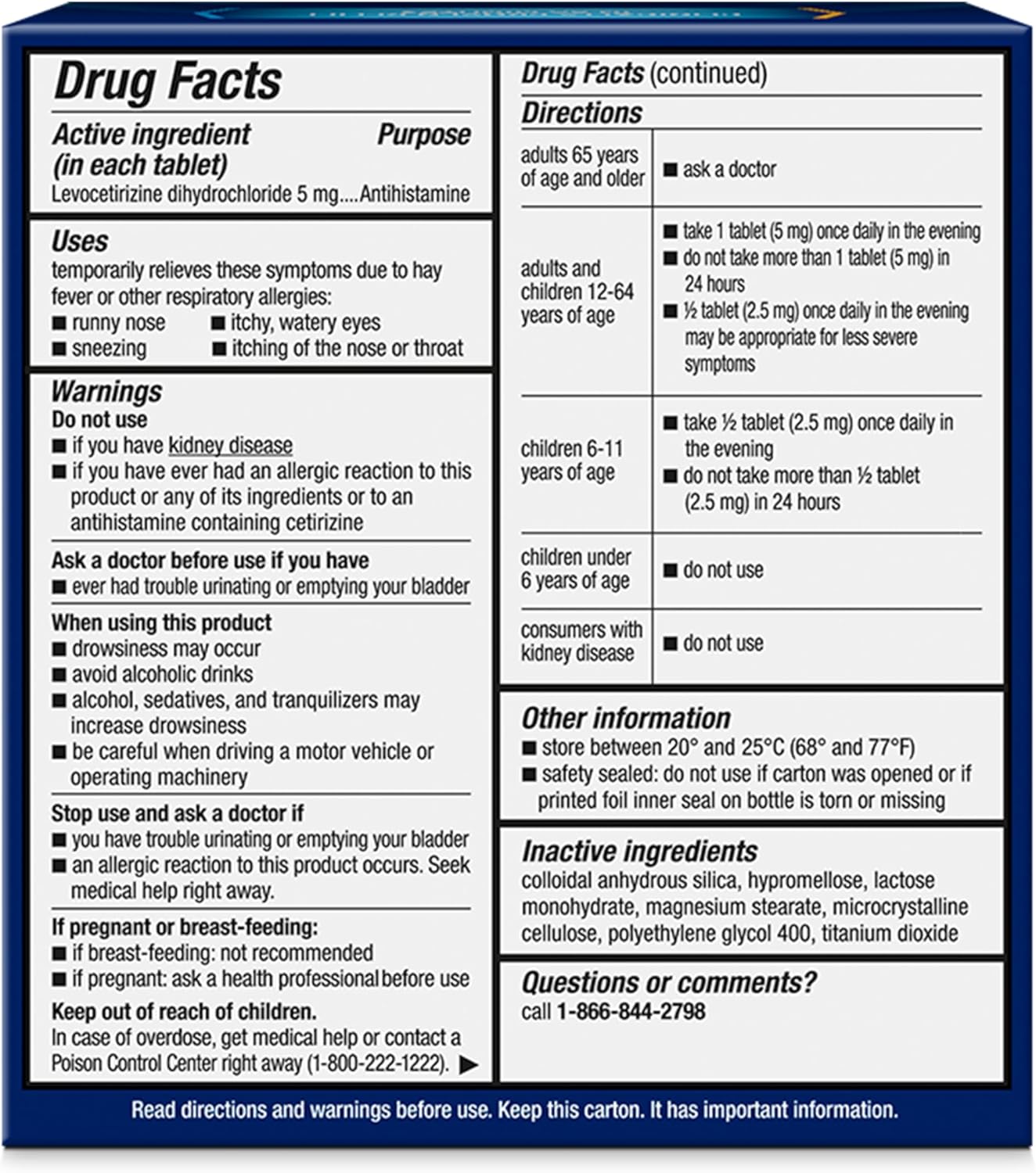 Contains: One (1) 80-Count Bottle Of Xyzal Allergy Pills, 24-Hour Allergy Relief, Original Prescription Strength