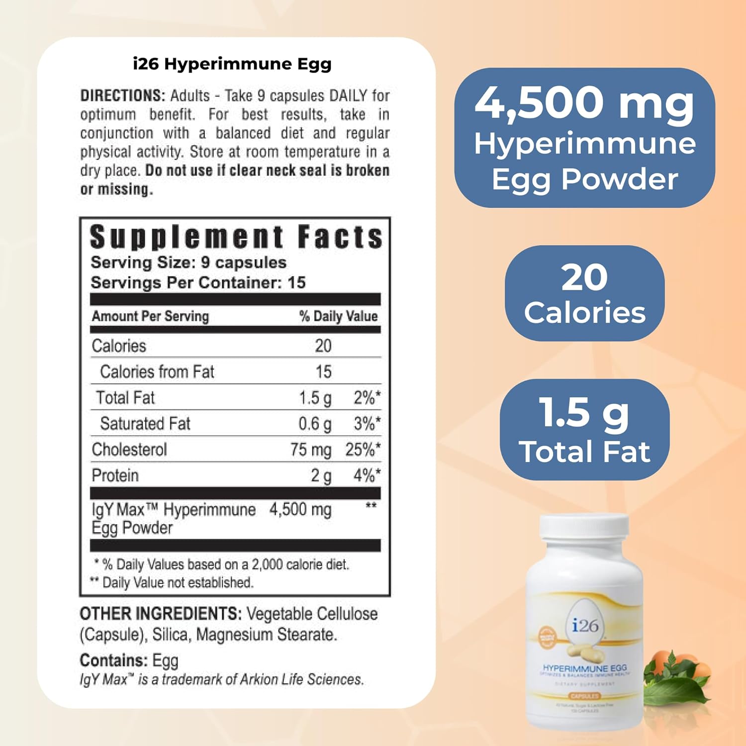 About this item Immune Support Supplement: Features hyperimmune egg powder, scientifically designed to help support and maintain a healthy immune system. Digestive Health and Gut Support: Includes unique bioactive proteins that promote gut health, contributing to overall digestive system balance. Scientifically Developed: Backed by over 20 years of research, i26 combines innovation with proven results for immune and digestive wellness. Non-GMO and Allergen-Friendly: Formulated to be non-GMO, gluten-free, and lactose-free, making it suitable for those with dietary restrictions. Supports Healthy Inflammatory Response: May help maintain a balanced inflammatory response for overall wellness. Certified Kosher and Halal: Meets strict dietary certification standards, ensuring quality and inclusivity for various lifestyle Daily Wellness Capsule: Convenient and easy-to-swallow capsules designed for consistent use as part of your daily health routine. Portable and Travel-Friendly: Perfect for maintaining immune and gut support while on the go or traveling. Natural Ingredients: Made with natural hyperimmune egg protein, offering bioavailable nutrients to support your body’s needs. Generous Supply: Contains 135 capsules per bottle, providing over a month’s supply of comprehensive immune and digestive support,Immune Support Supplement: Features hyperimmune egg powder, scientifically designed to help support and maintain a healthy immune system,Digestive Health and Gut Support: Includes unique bioactive proteins that promote gut health, contributing to overall digestive system balance,Scientifically Developed: Backed by over 20 years of research, i26 combines innovation with proven results for immune and digestive wellness,Non-GMO and Allergen-Friendly: Formulated to be non-GMO, gluten-free, and lactose-free, making it suitable for those with dietary restrictions,Supports Healthy Inflammatory Response: May help maintain a balanced inflammatory response for overall wellness,Certified Kosher and Halal: Meets strict dietary certification standards, ensuring quality and inclusivity for various lifestyle,Daily Wellness Capsule: Convenient and easy-to-swallow capsules designed for consistent use as part of your daily health routine,Portable and Travel-Friendly: Perfect for maintaining immune and gut support while on the go or traveling,Natural Ingredients: Made with natural hyperimmune egg protein, offering bioavailable nutrients to support your body’s needs,Generous Supply: Contains 135 capsules per bottle, providing over a month’s supply of comprehensive immune and digestive support