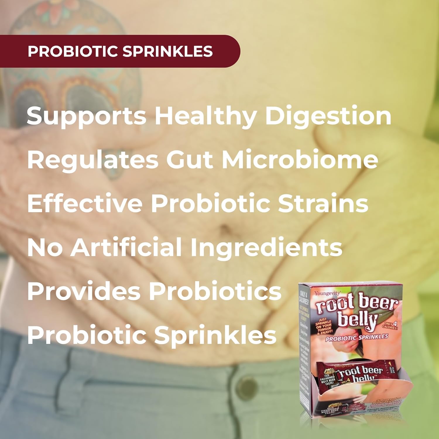 About this item Delicious: The best way to motivate healthy habits like daily probiotics, is to take one that is absolutely delicious. Look no further! Adults and children alike will be asking for more! Effective: Unlike other probiotic products, each sprinkle is coated, making it capable of surviving stomach acidity and cultivating in your intenstines. Natural: Root Beer Belly is Gluten-Free, Dairy-Free, Glycemic-Friendly, and contains only 4 calories. Quality: With over 10 billion probiotic strains at the time of production, we guarantee at least 5 billion.. but there are likely much more! Full Nutrition: Give yourself and those around you complete health with the addition of Youngevity Ultimate Classic, Youngevity Kid's Toddy, Youngevity Ultimate EFA, and more! See more product details,Delicious: The best way to motivate healthy habits like daily probiotics, is to take one that is absolutely delicious. Look no further! Adults and children alike will be asking for more!,Effective: Unlike other probiotic products, each sprinkle is coated, making it capable of surviving stomach acidity and cultivating in your intenstines,Natural: Root Beer Belly is Gluten-Free, Dairy-Free, Glycemic-Friendly, and contains only 4 calories,Quality: With over 10 billion probiotic strains at the time of production, we guarantee at least 5 billion.. but there are likely much more!,Full Nutrition: Give yourself and those around you complete health with the addition of Youngevity Ultimate Classic, Youngevity Kid's Toddy, Youngevity Ultimate EFA, and more!