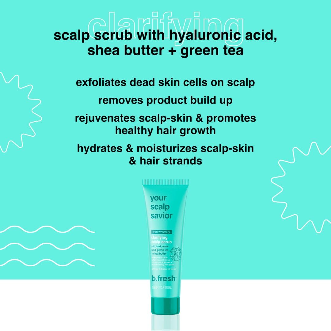 a clarifying scalp scrub to exfoliate away dead cells & product build-up to rejuvenate scalp-skin and promote healthy hair growth. enriched with hair + scalp loving hyaluronic acid, shea butter + green tea,i help to rejuvenate scalp-skin and promote healthier hair growth,i exfoliate away dead skin cells,removes product build-up to improve hair health,hydrates & moisturizes scalp-skin and hair strands,fresh wild waterlily scent,enriched with hair + scalp loving hyaluronic acid, shea butter + green tea