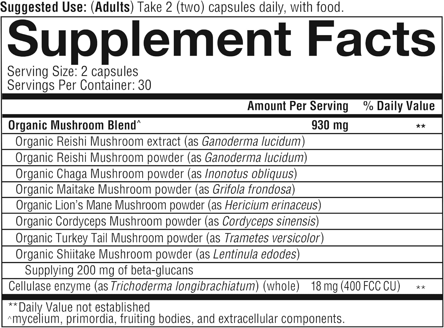 4 >Our Complex features a 930 mg total blend per serving of: Organic Reishi Mushroom Extract, Organic Reishi Mushroom Powder, Organic Chaga Mushroom Powder, Organic Maitake Mushroom Powder, Organic Lion’s Mane Mushroom, Organic Cordyceps Mushroom Powder, Organic Turkey Tail Mushroom Powder, Organic Shiitake Mushroom Powder