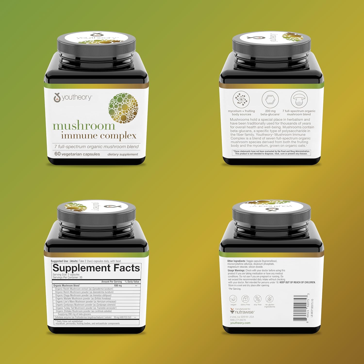 2 >7 FULL-SPECTRUM ORGANIC MUSHROOM BLEND: Youtheory Mushroom Complex is formulated using seven different species of full-spectrum organic mushrooms, providing the benefits of all components of the mushroom family, including mycelium, primordia, fruiting bodies and extracellular components