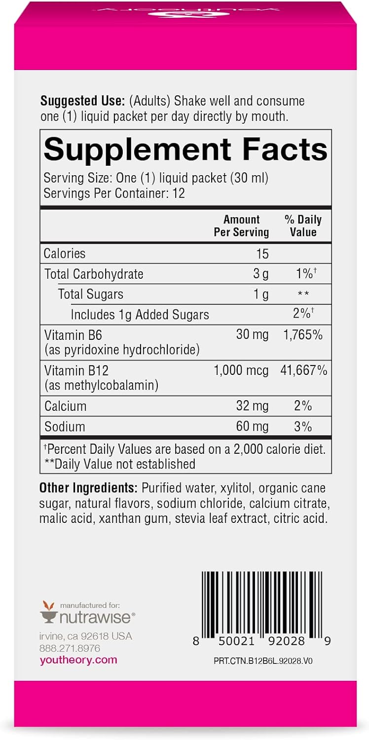 DESCRIPTION : Youtheory Vitamin B12 B6, Daily Energy and Brain Support Supplement, Liquid Raspberry Flavor, 12 β 1oz Single Serving Packets
